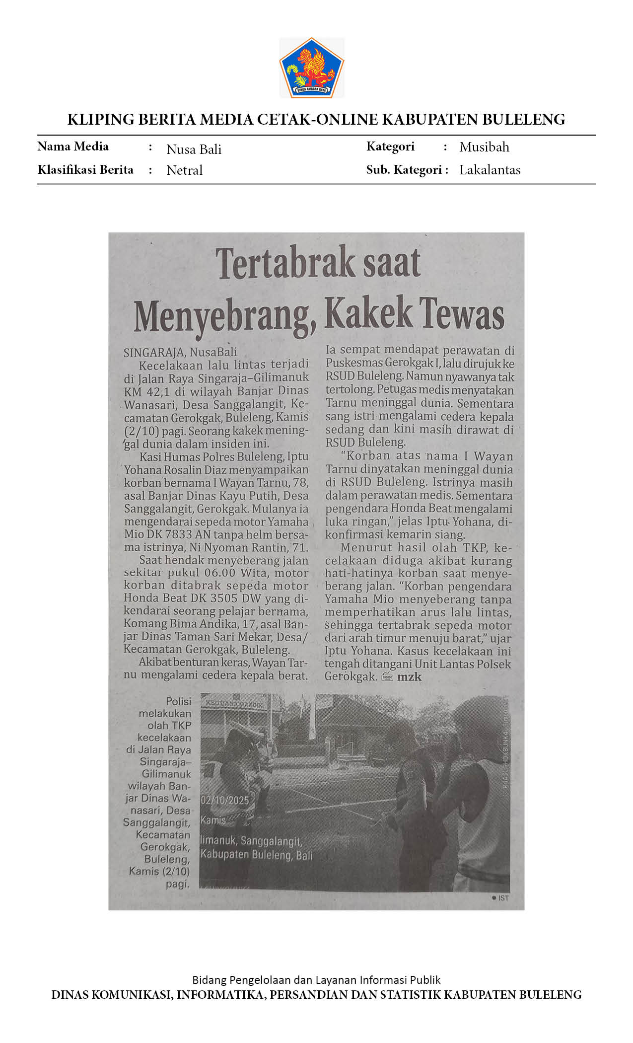 PICKUP PENUH MUATAN TIMPA PENGENDARA MOTOR HINGGA TEWAS DI SAMBANGAN, BULELENG