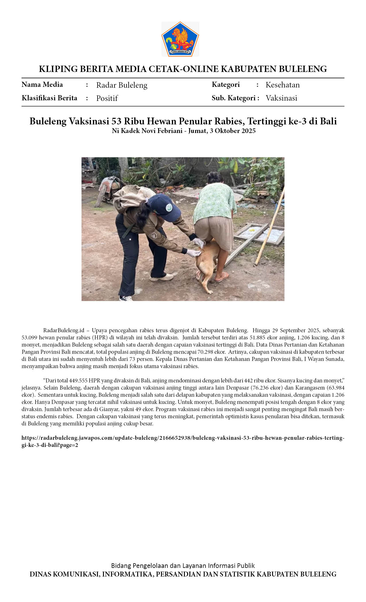 BULELENG VAKSINASI 53 RIBU HEWAN PENULAR RABIES, TERTINGGI KE-3 DI BALI