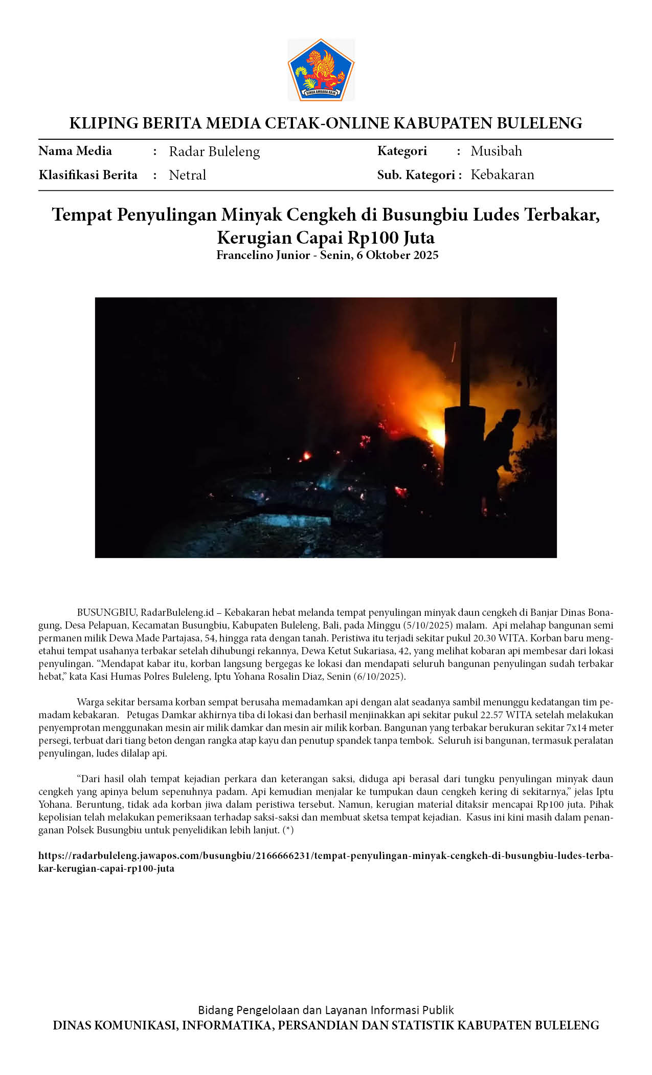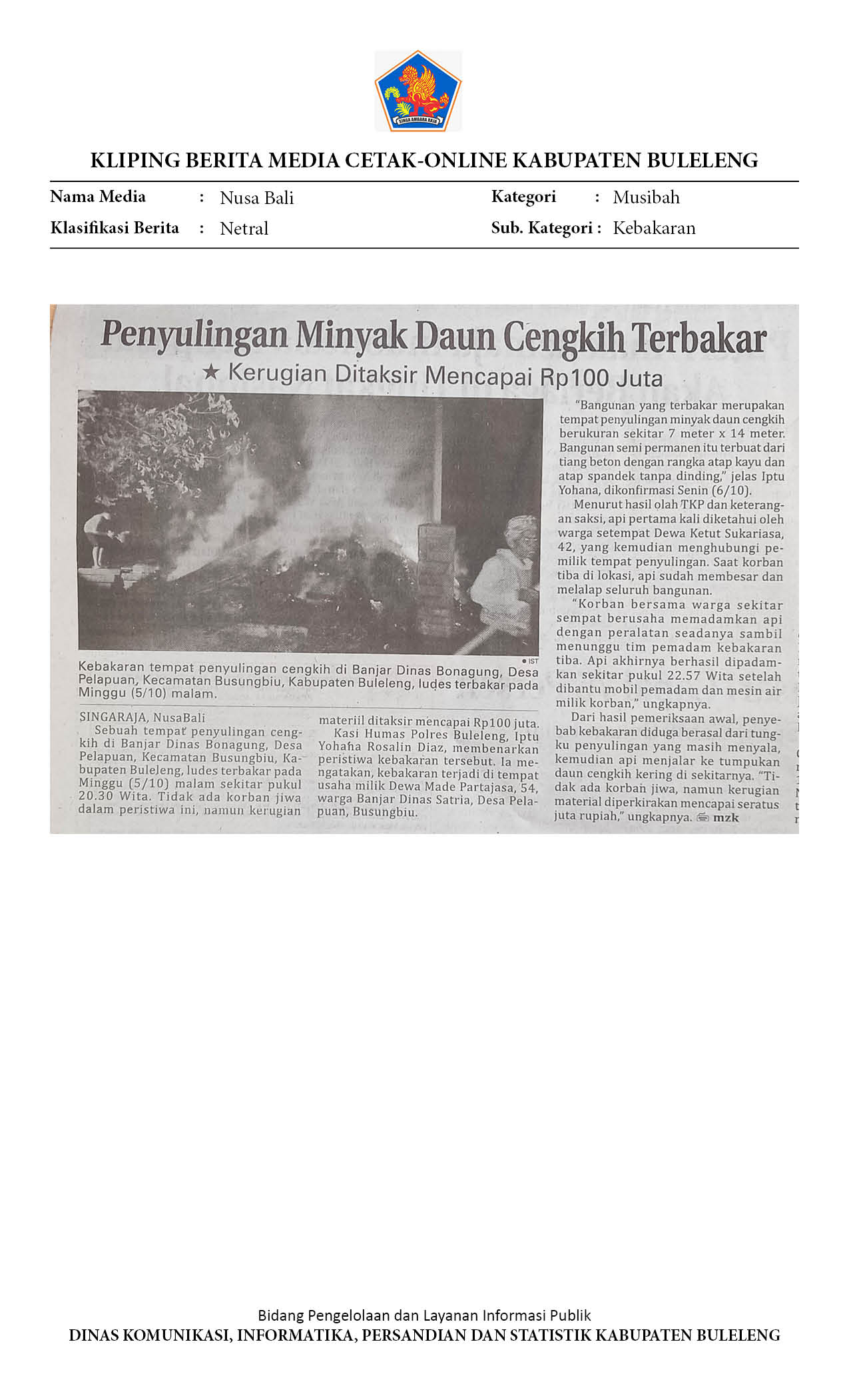 TEMPAT PENYULINGAN MINYAK CENGKEH DI BUSUNGBIU LUDES TERBAKAR, KERUGIAN CAPAI RP100 JUTA