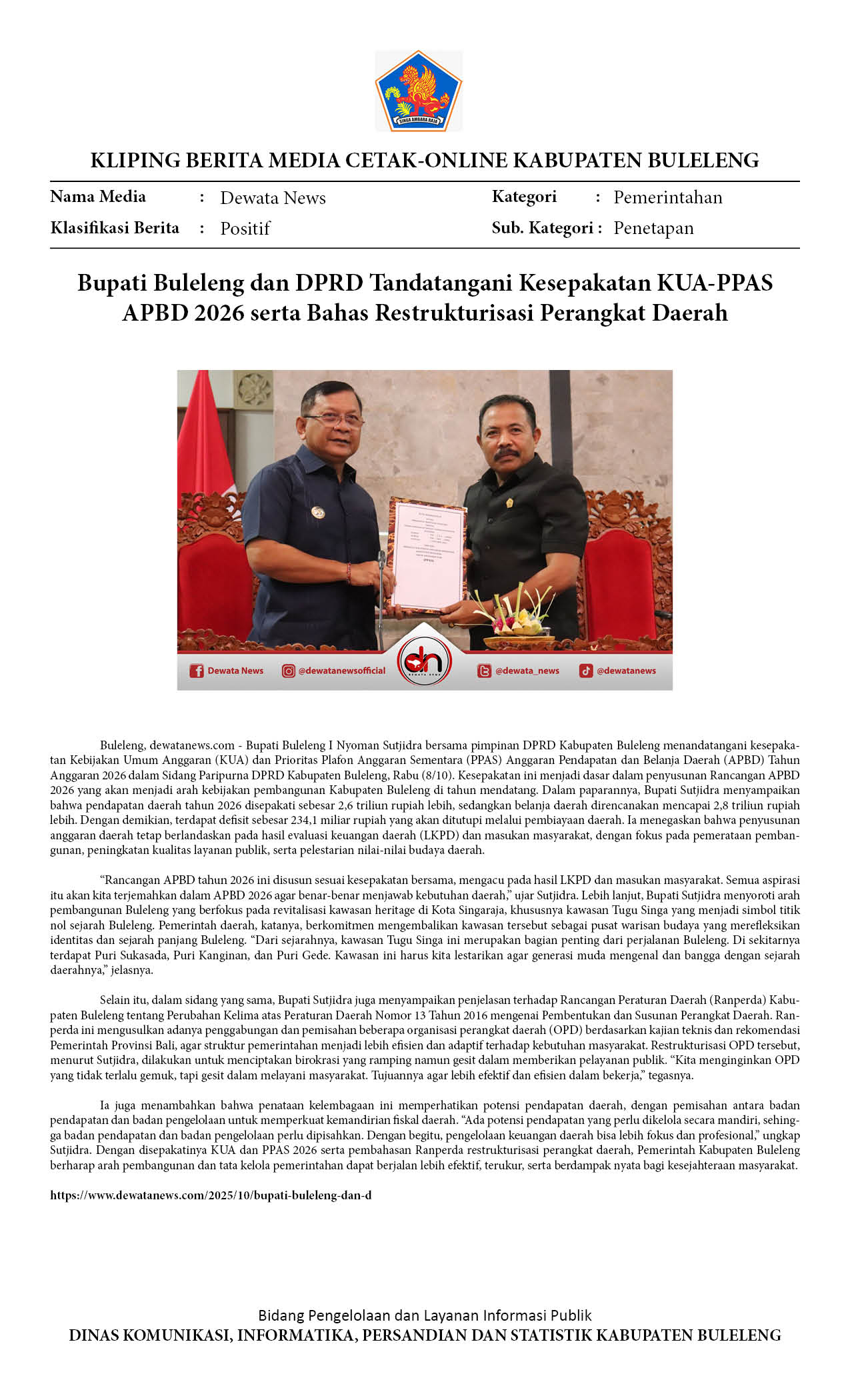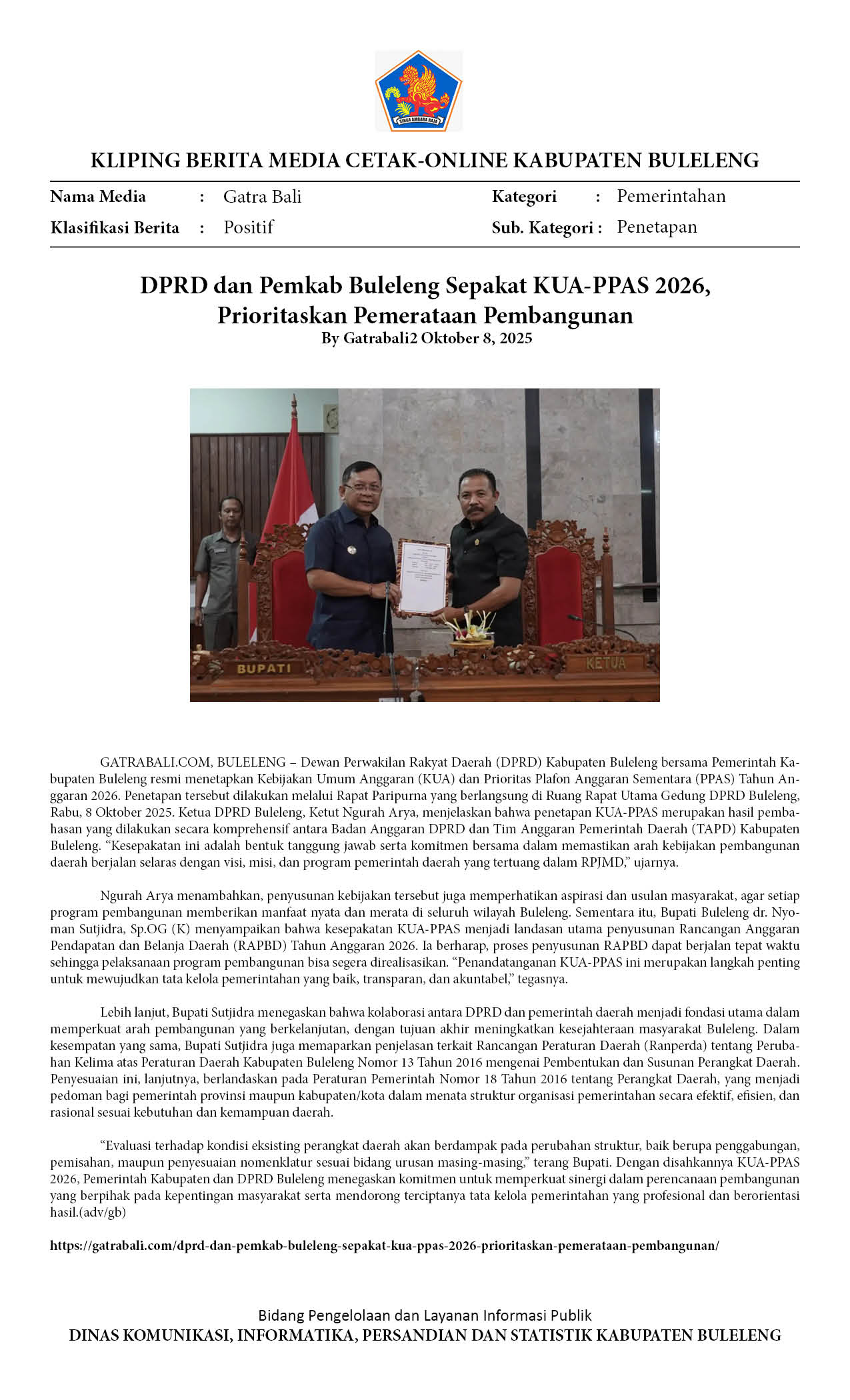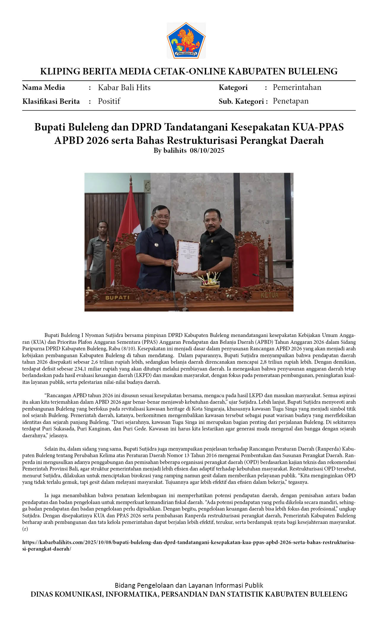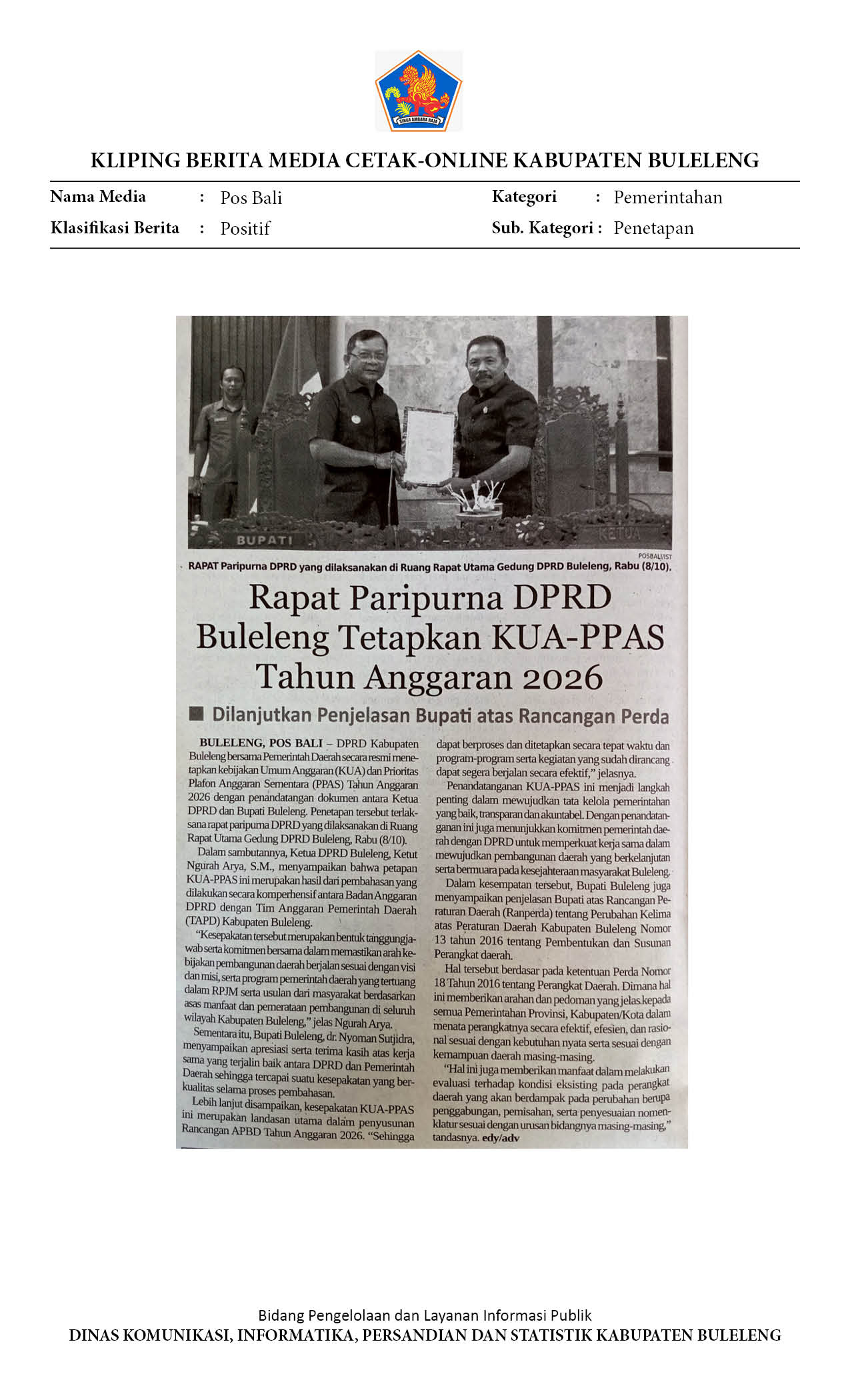 BUPATI BULELENG DAN DPRD SEPAKATI KUA-PPAS APBD 2026 DAN BAHAS RESTRUKTURISASI PERANGKAT DAERAH