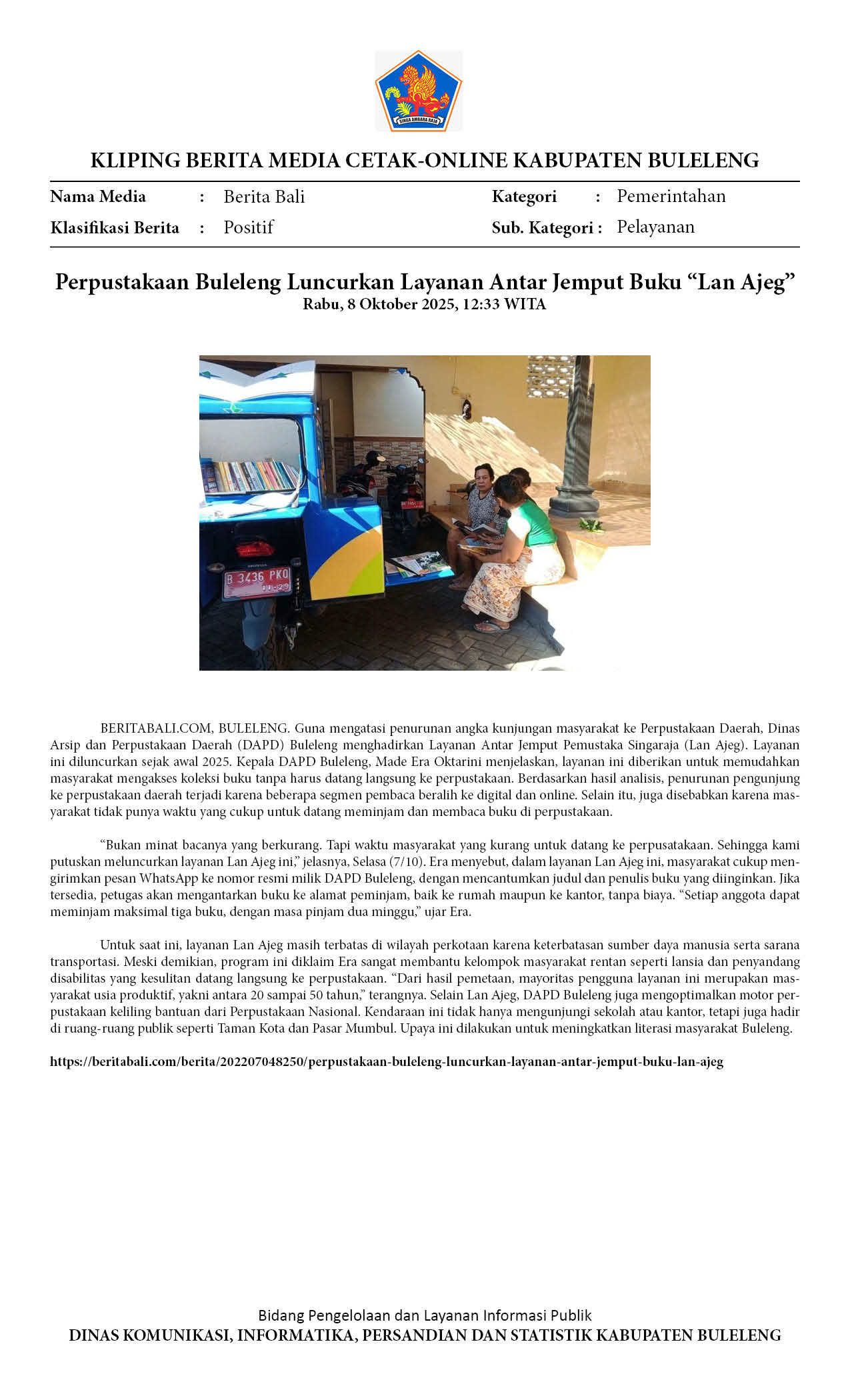 PERPUSTAKAAN BULELENG LUNCURKAN LAYANAN ANTAR JEMPUT BUKU “LAN AJEG”