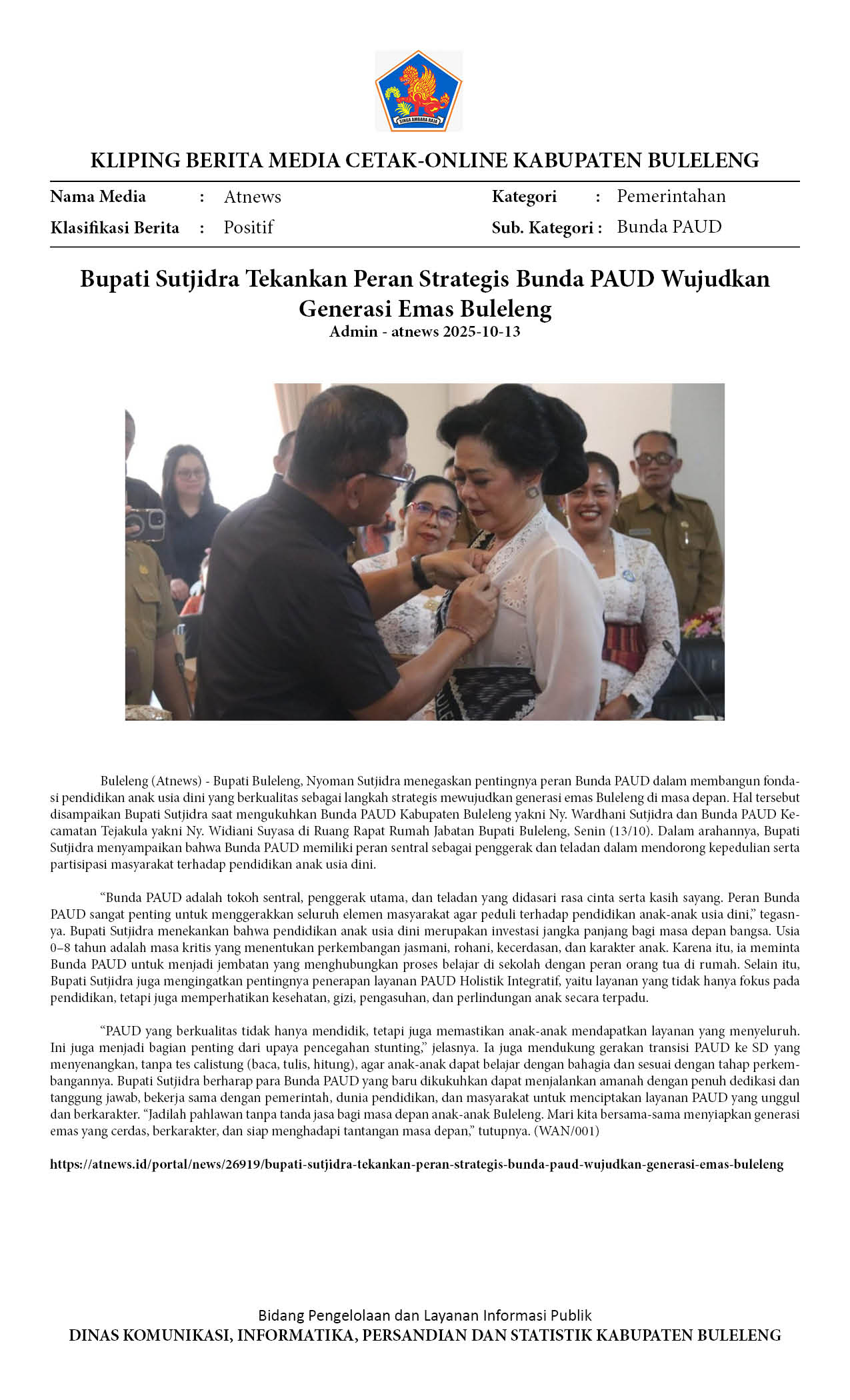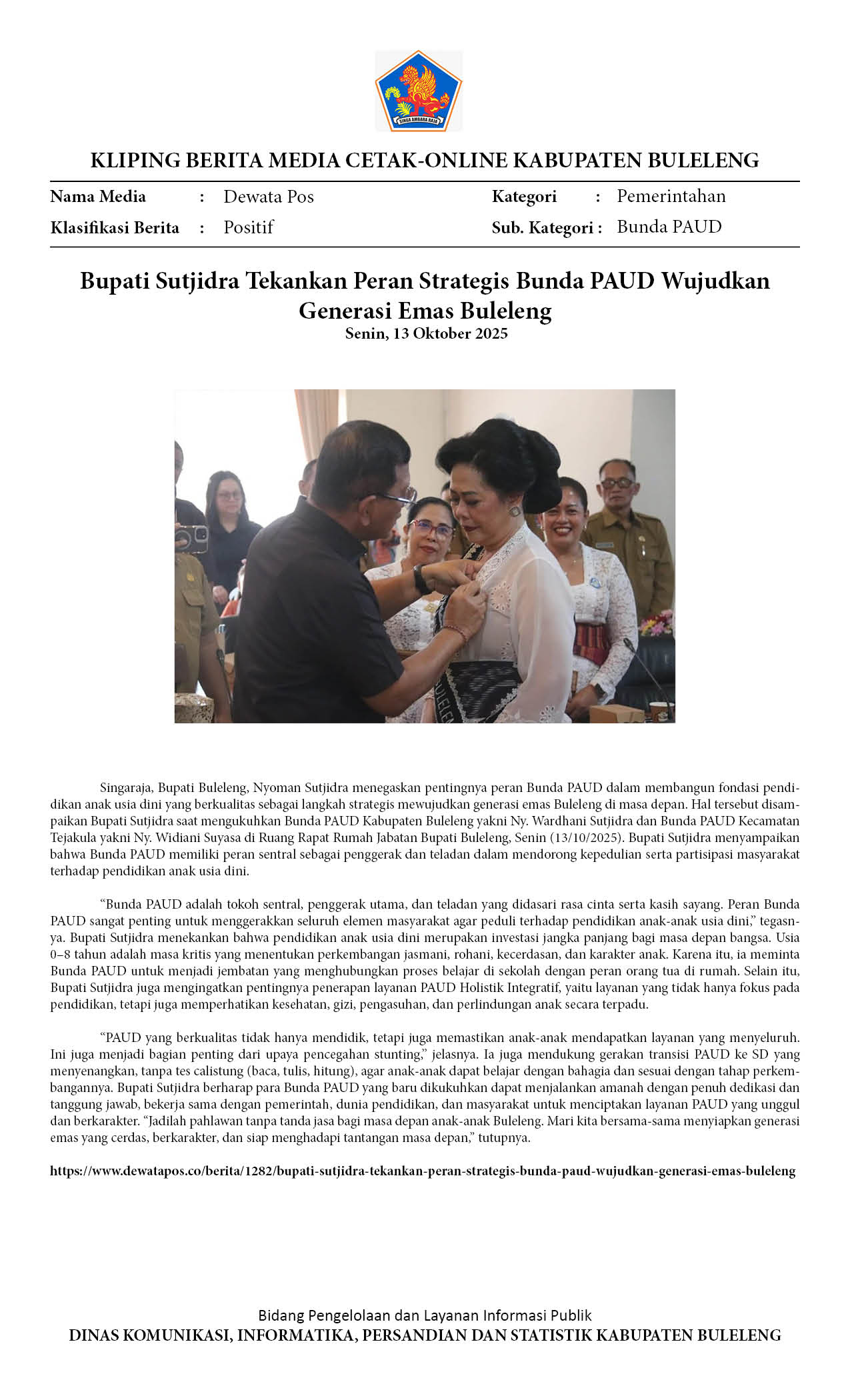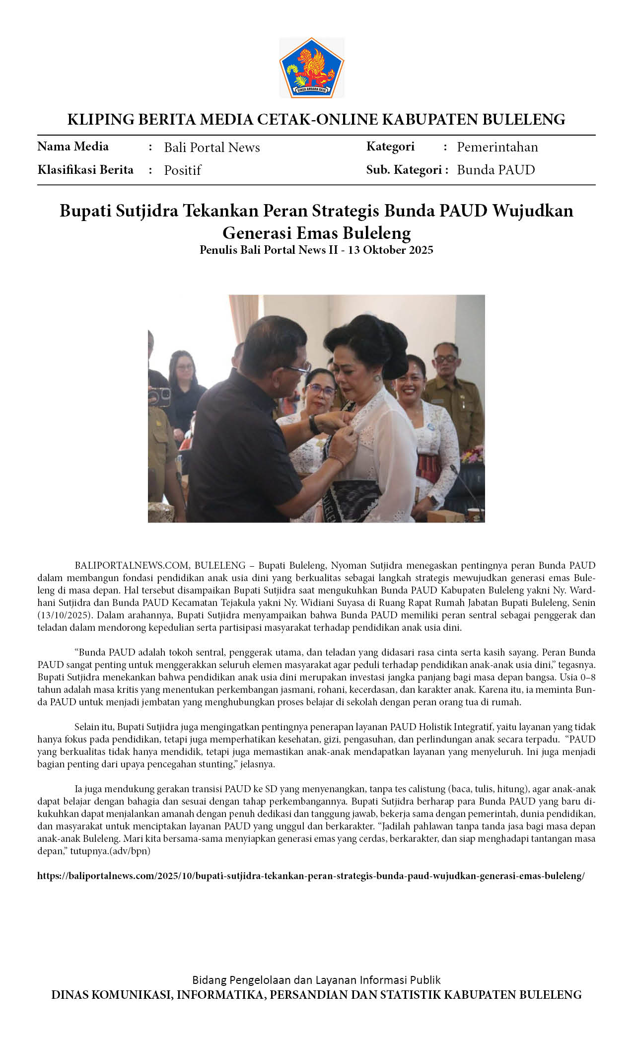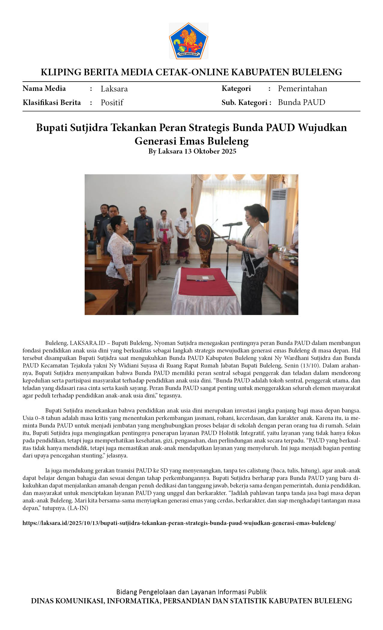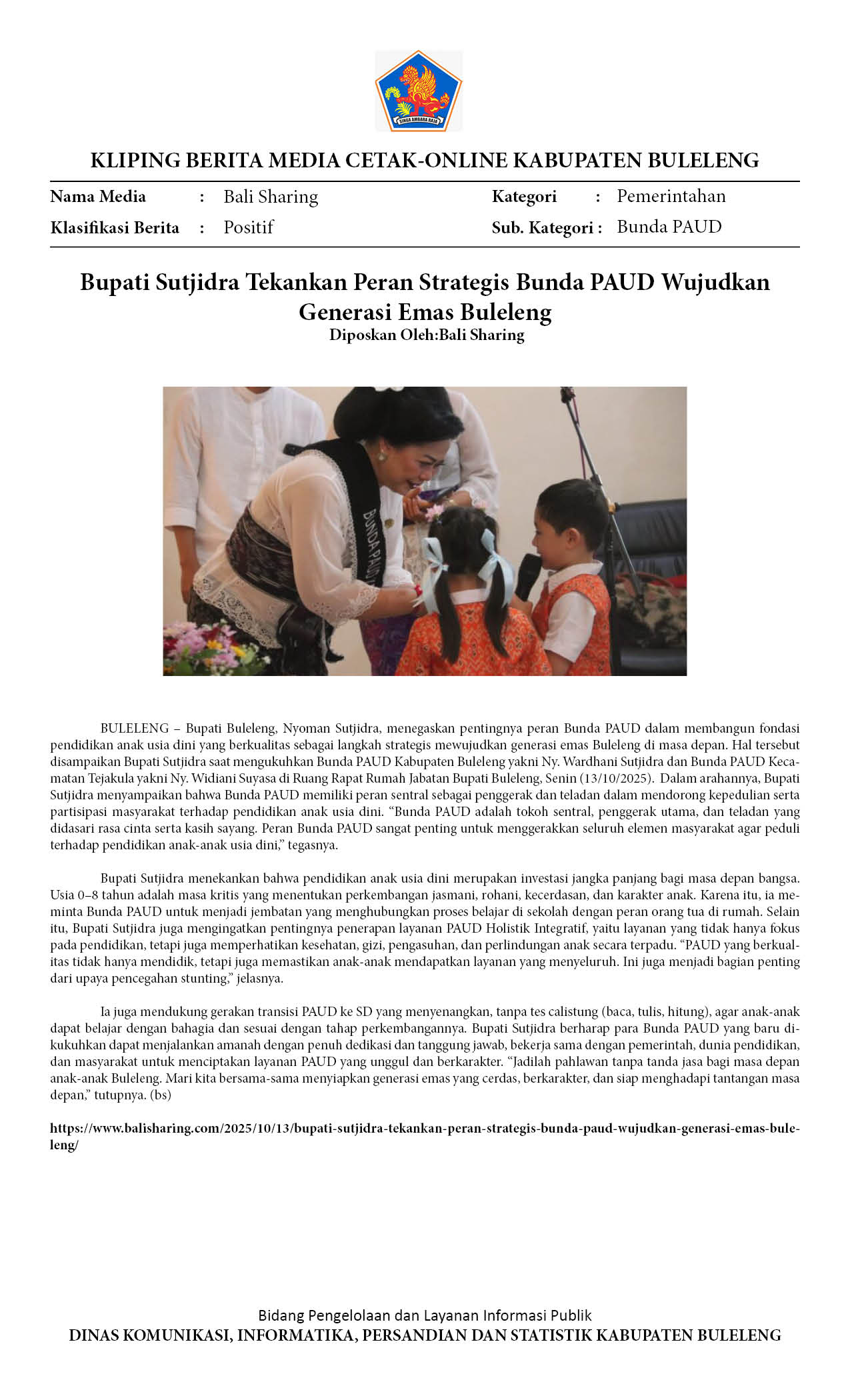 BUPATI SUTJIDRA TEKANKAN PERAN STRATEGIS BUNDA PAUD WUJUDKAN GENERASI EMAS BULELENG