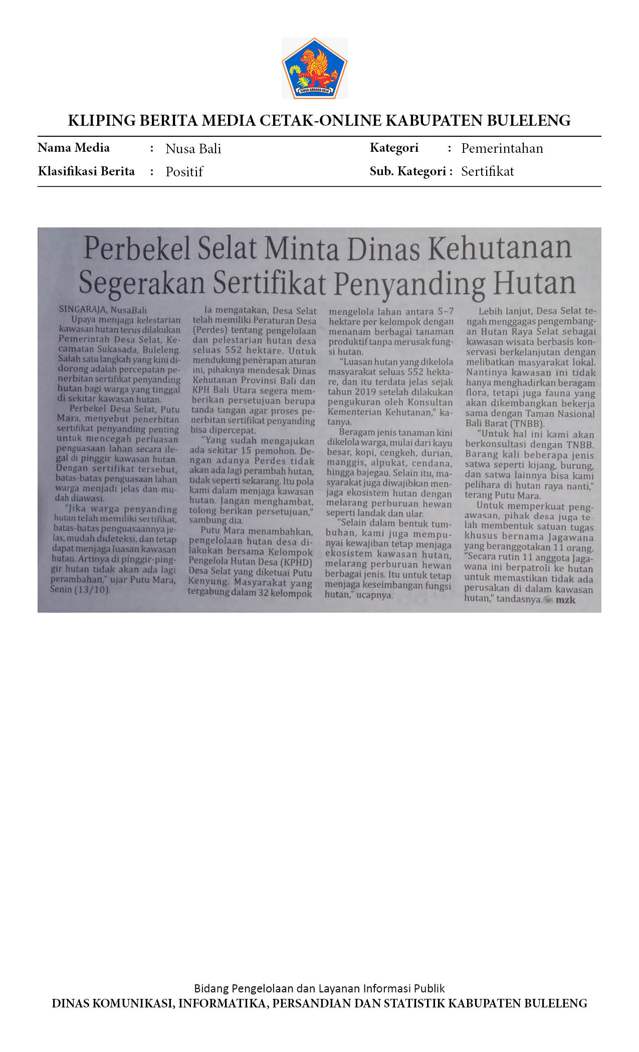 PERBEKEL SELAT MINTA DINAS KEHUTANAN SEGERAKAN SERTIFIKAT PENYANDING HUTAN