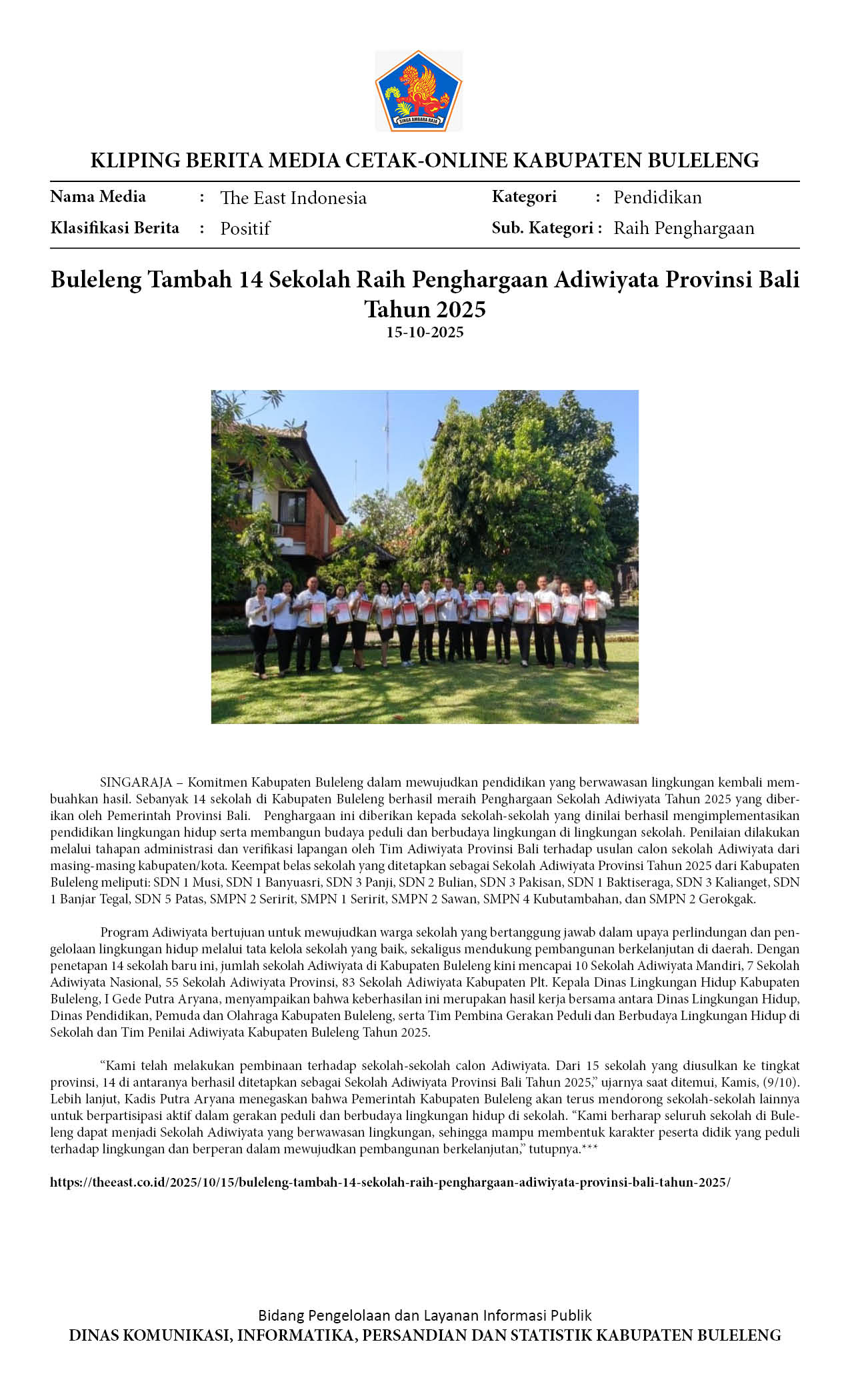 BULELENG TAMBAH 14 SEKOLAH RAIH PENGHARGAAN ADIWIYATA PROVINSI BALI TAHUN 2025