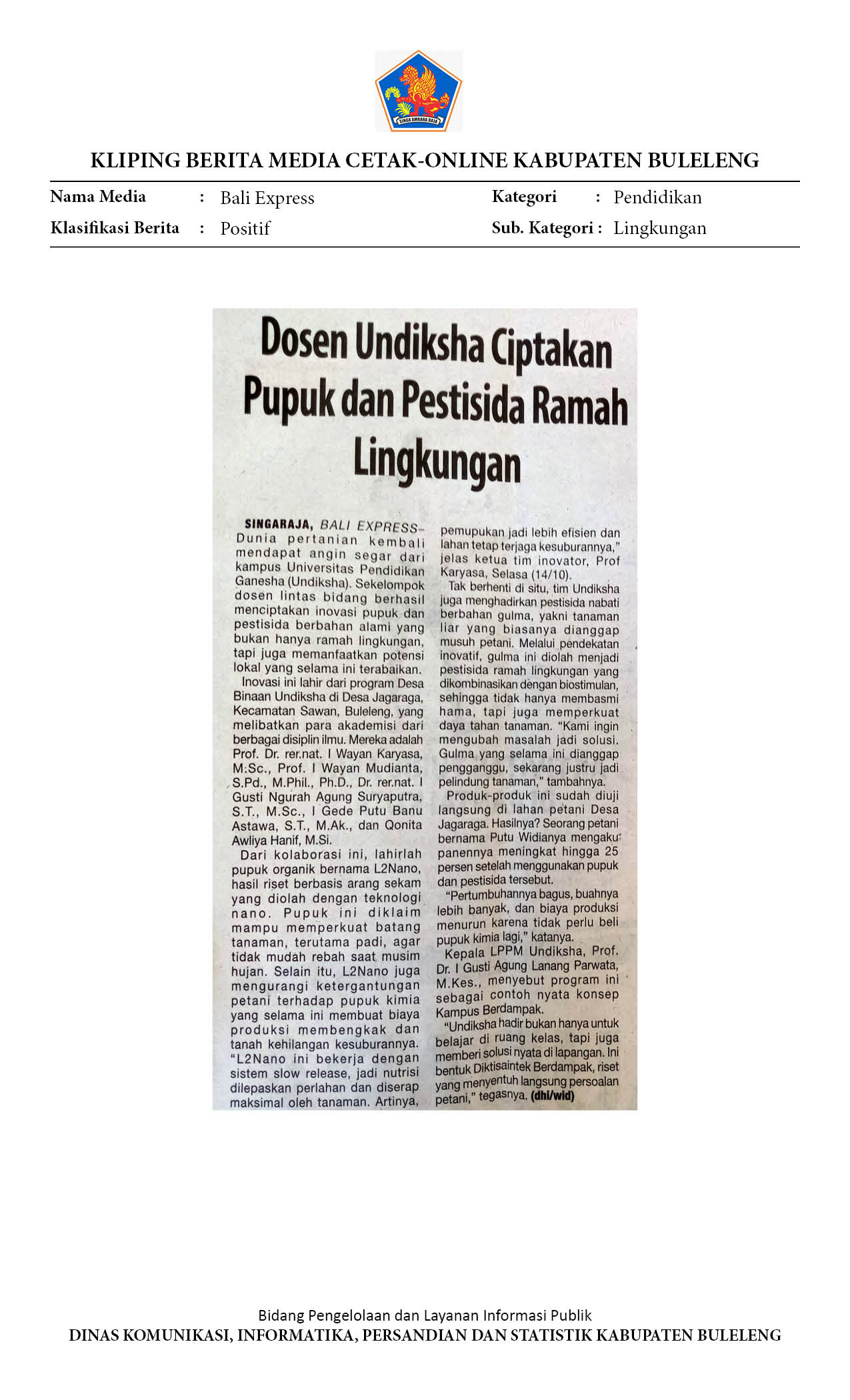 JAWAB TANTANGAN PERTANIAN, AKADEMISI UNDIKSHA CIPTAKAN PUPUK L2NANO DAN PESTISIDA NABATI BERBAHAN LOKAL