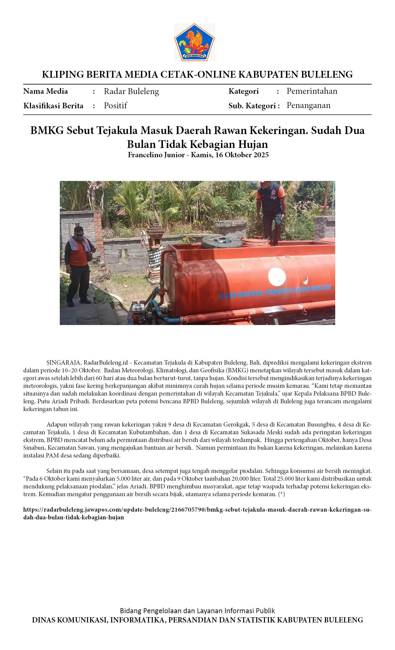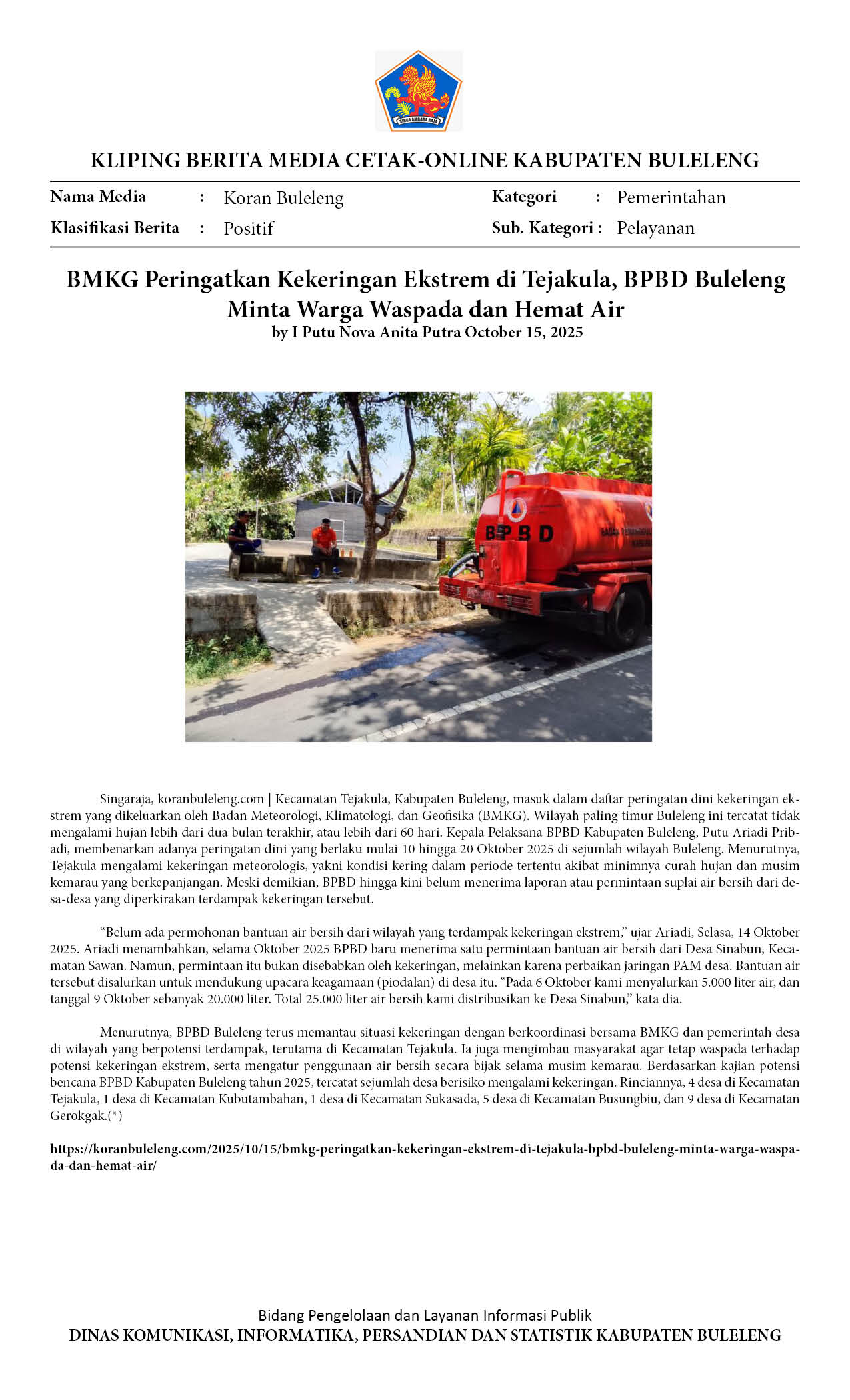 BMKG PERINGATKAN KEKERINGAN EKSTREM DI TEJAKULA, BPBD BULELENG MINTA WARGA WASPADA DAN HEMAT AIR