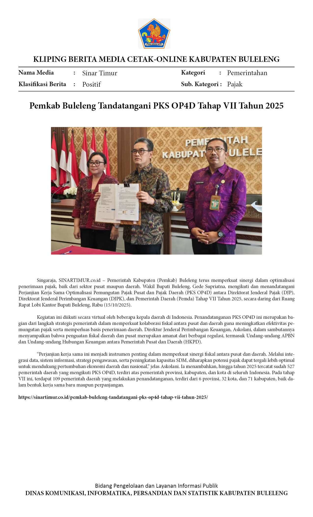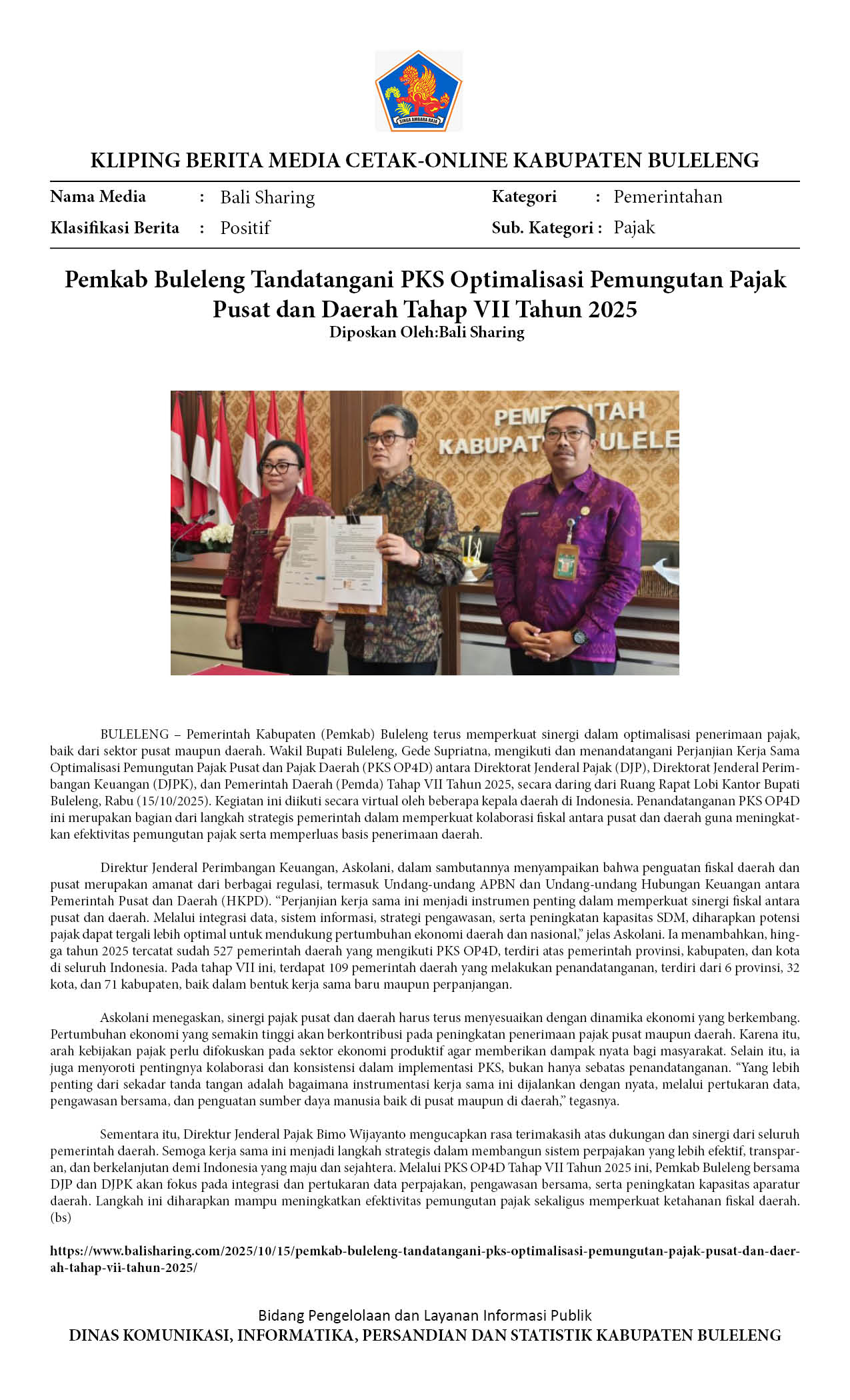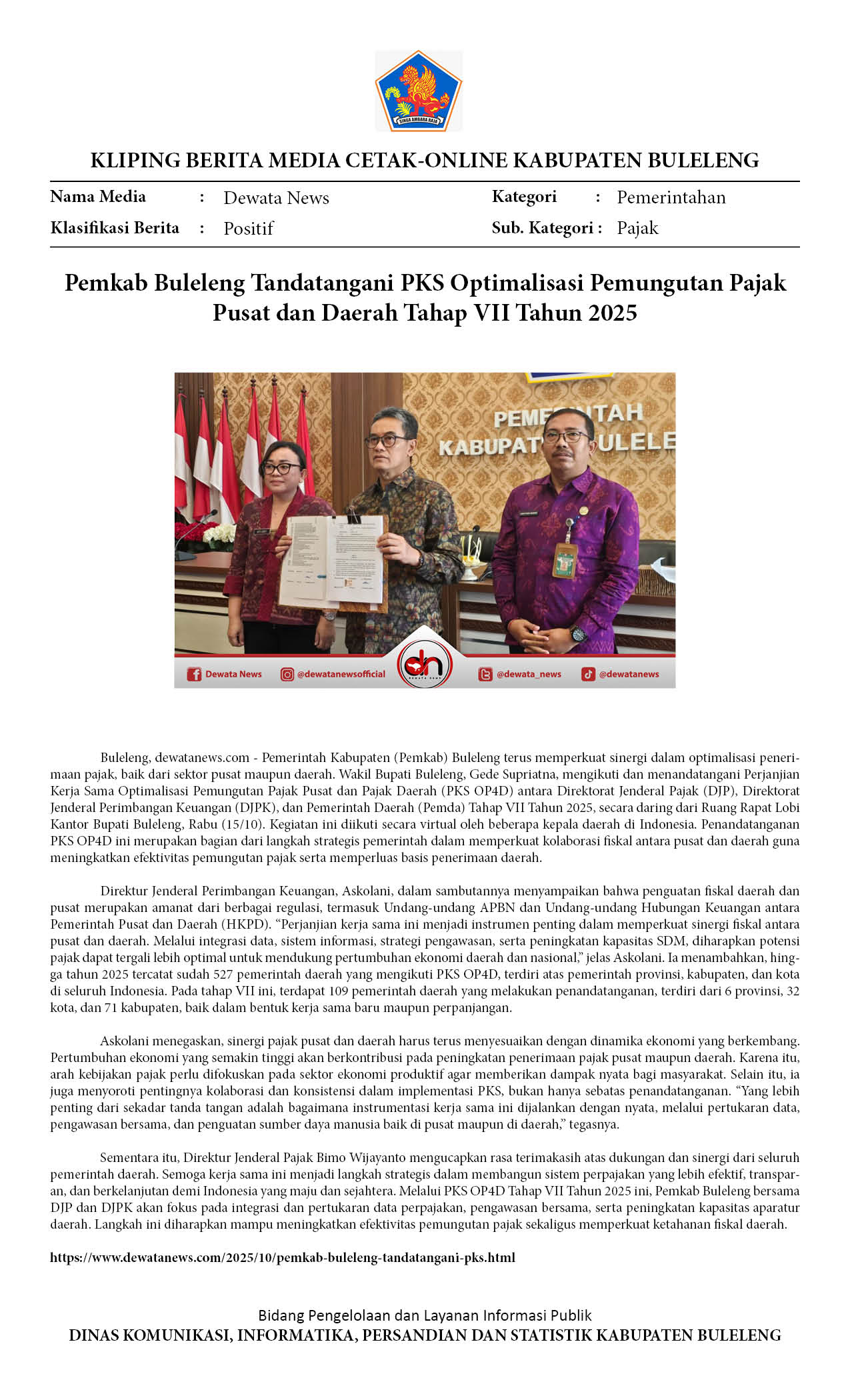 PEMKAB BULELENG TANDATANGANI PKS OPTIMALISASI PEMUNGUTAN PAJAK PUSAT DAN DAERAH TAHAP VII TAHUN 2025