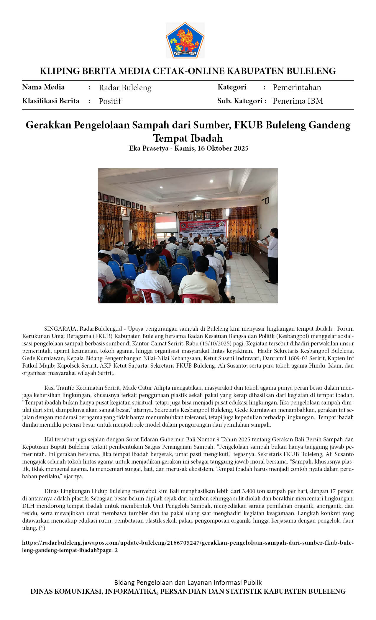 GERAKKAN PENGELOLAAN SAMPAH DARI SUMBER, FKUB BULELENG GANDENG TEMPAT IBADAH