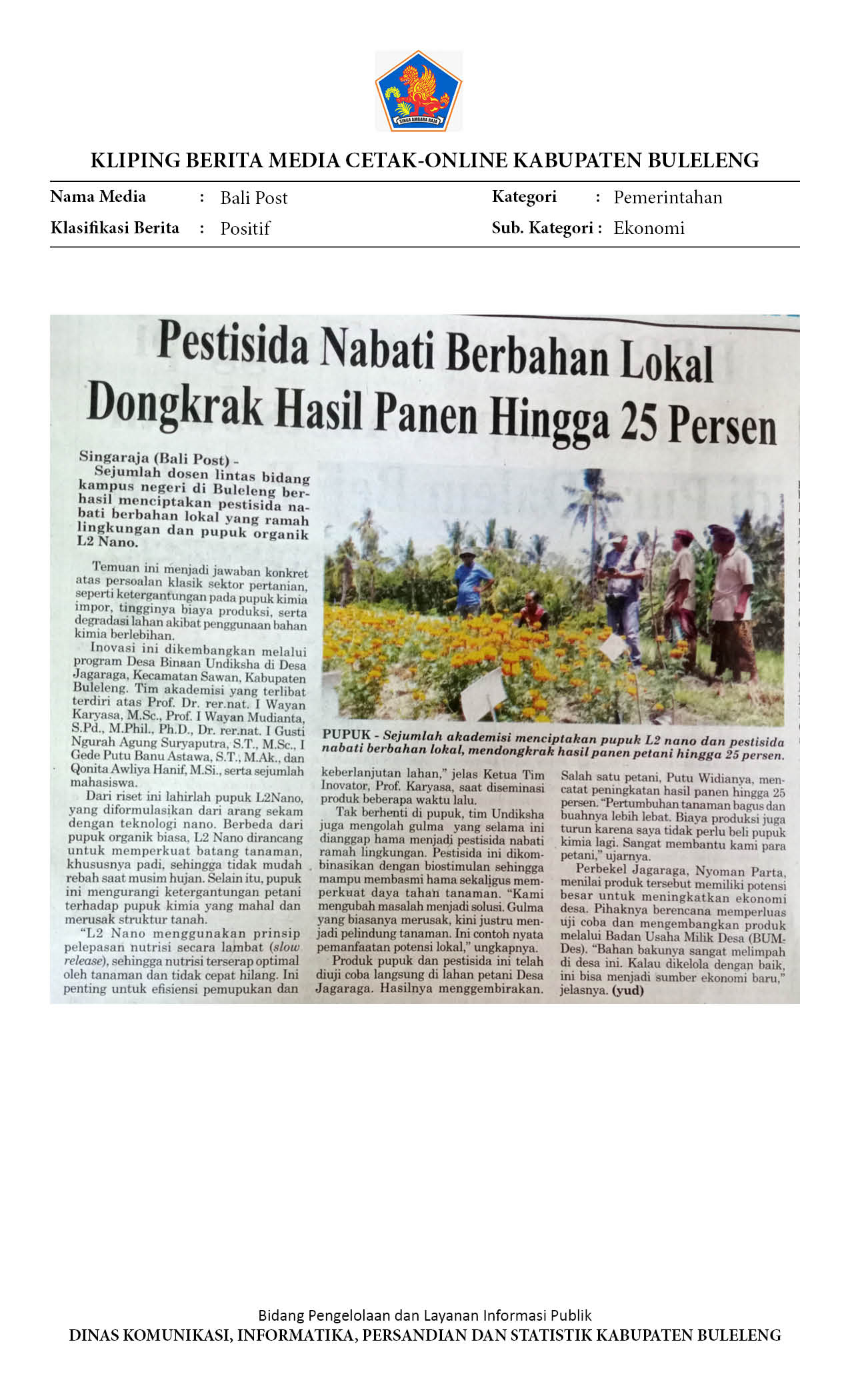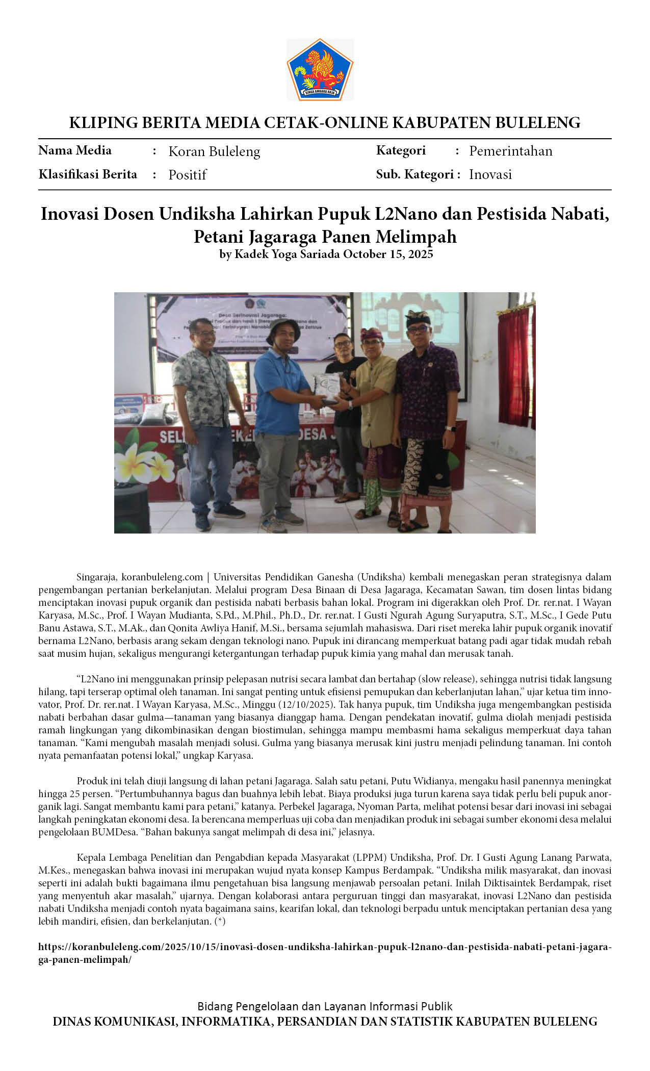 INOVASI DOSEN UNDIKSHA LAHIRKAN PUPUK L2NANO DAN PESTISIDA NABATI, PETANI JAGARAGA PANEN MELIMPAH