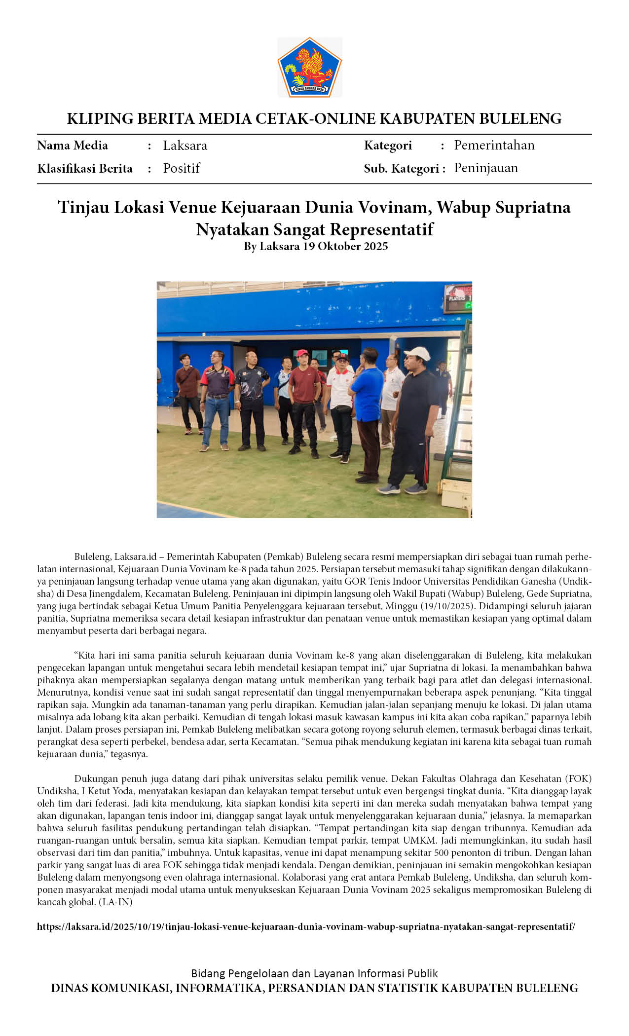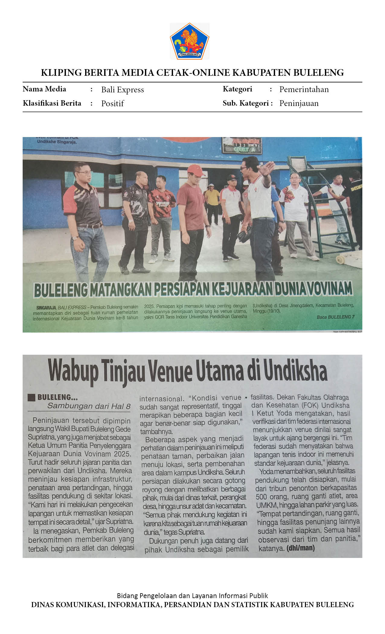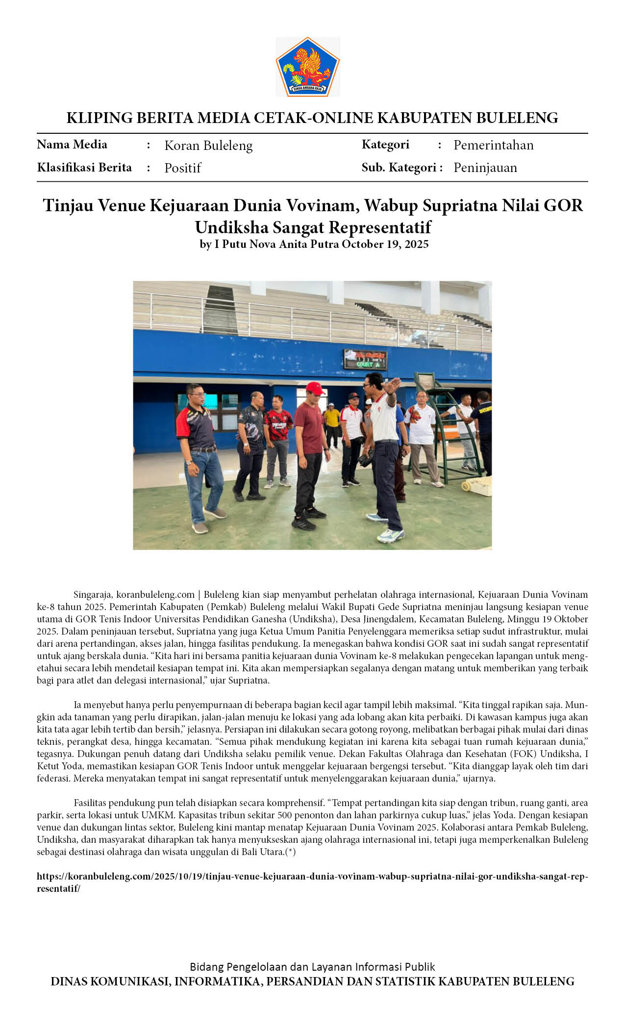 TINJAU VENUE KEJUARAAN DUNIA VOVINAM, WABUP SUPRIATNA NILAI GOR UNDIKSHA SANGAT REPRESENTATIF