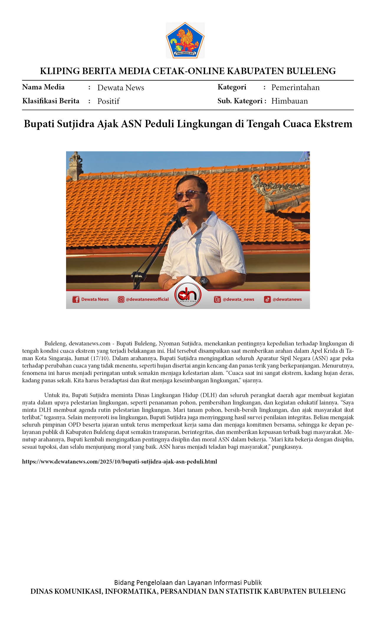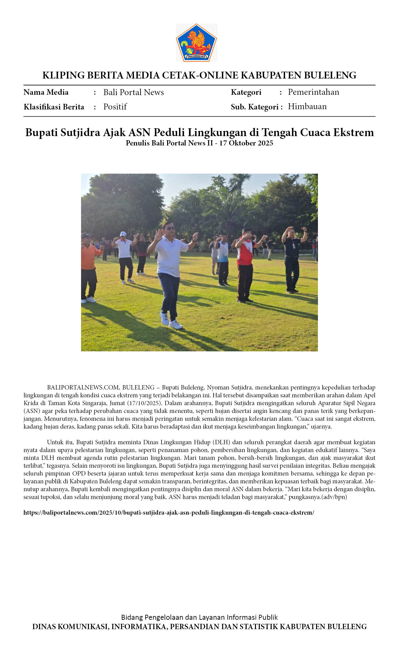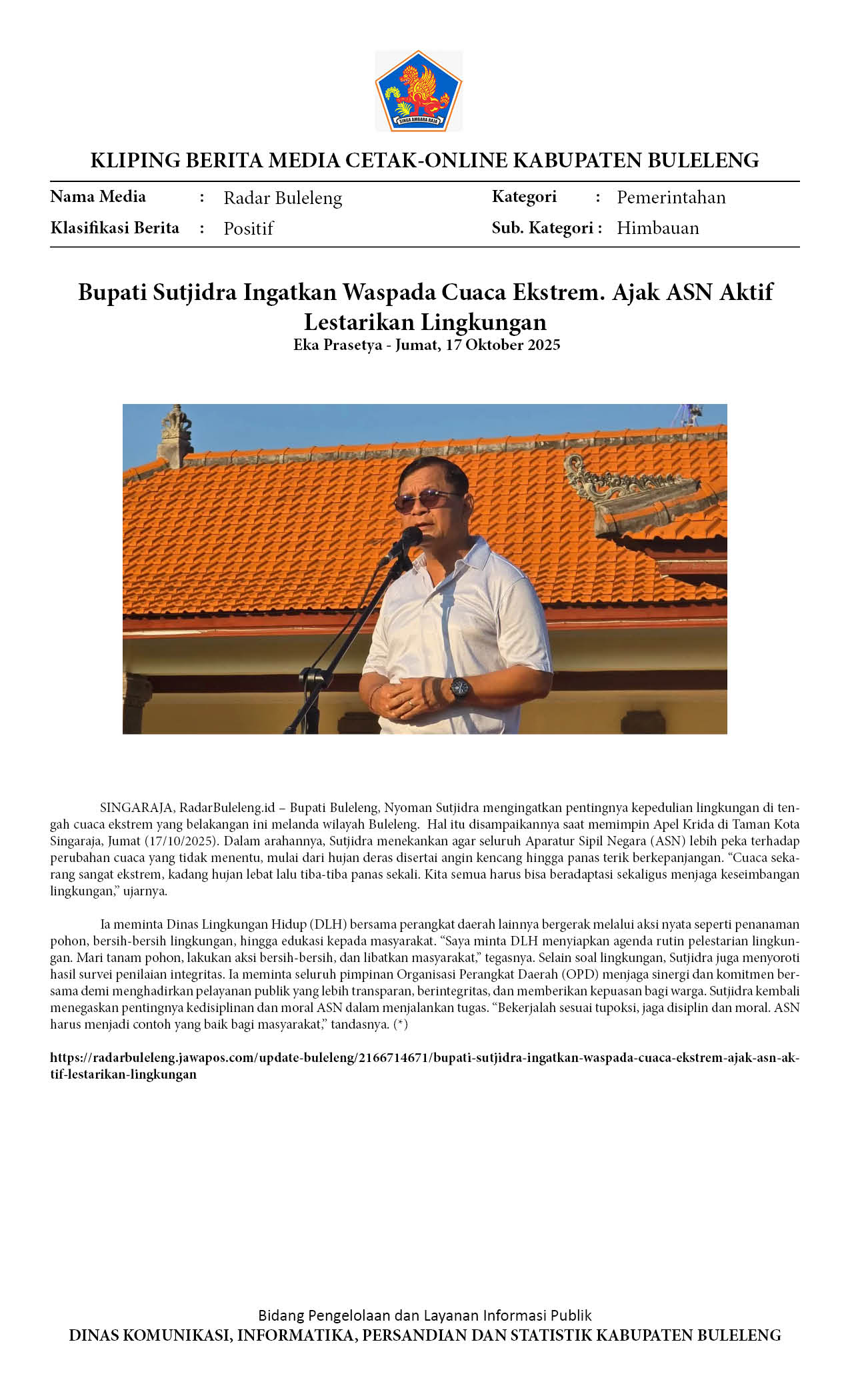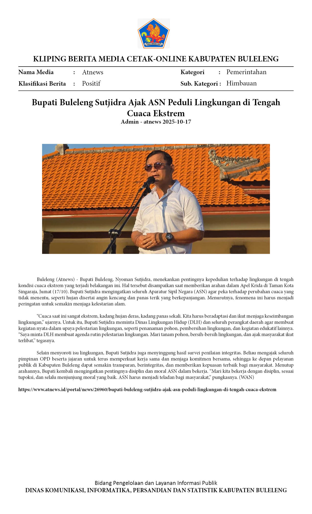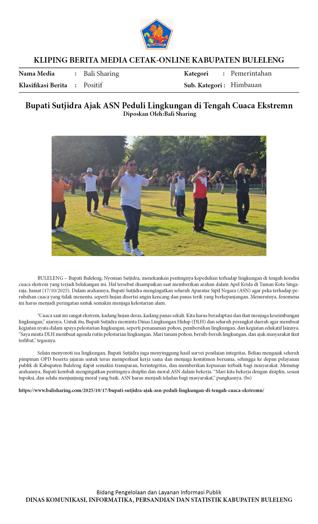 BUPATI BULELENG SUTJIDRA AJAK ASN PEDULI LINGKUNGAN DI TENGAH CUACA EKSTREM