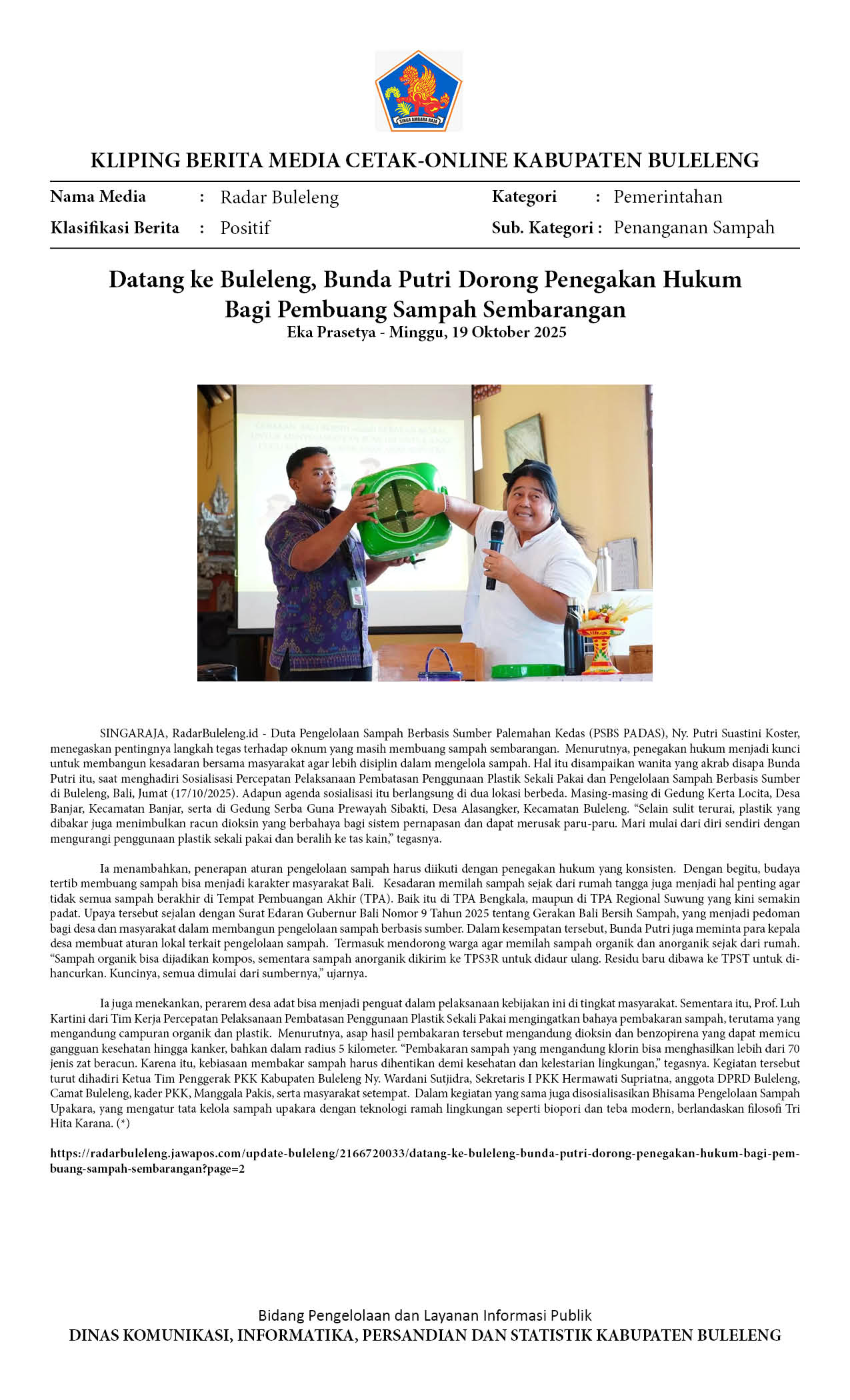 DATANG KE BULELENG, BUNDA PUTRI DORONG PENEGAKAN HUKUM BAGI PEMBUANG SAMPAH SEMBARANGAN