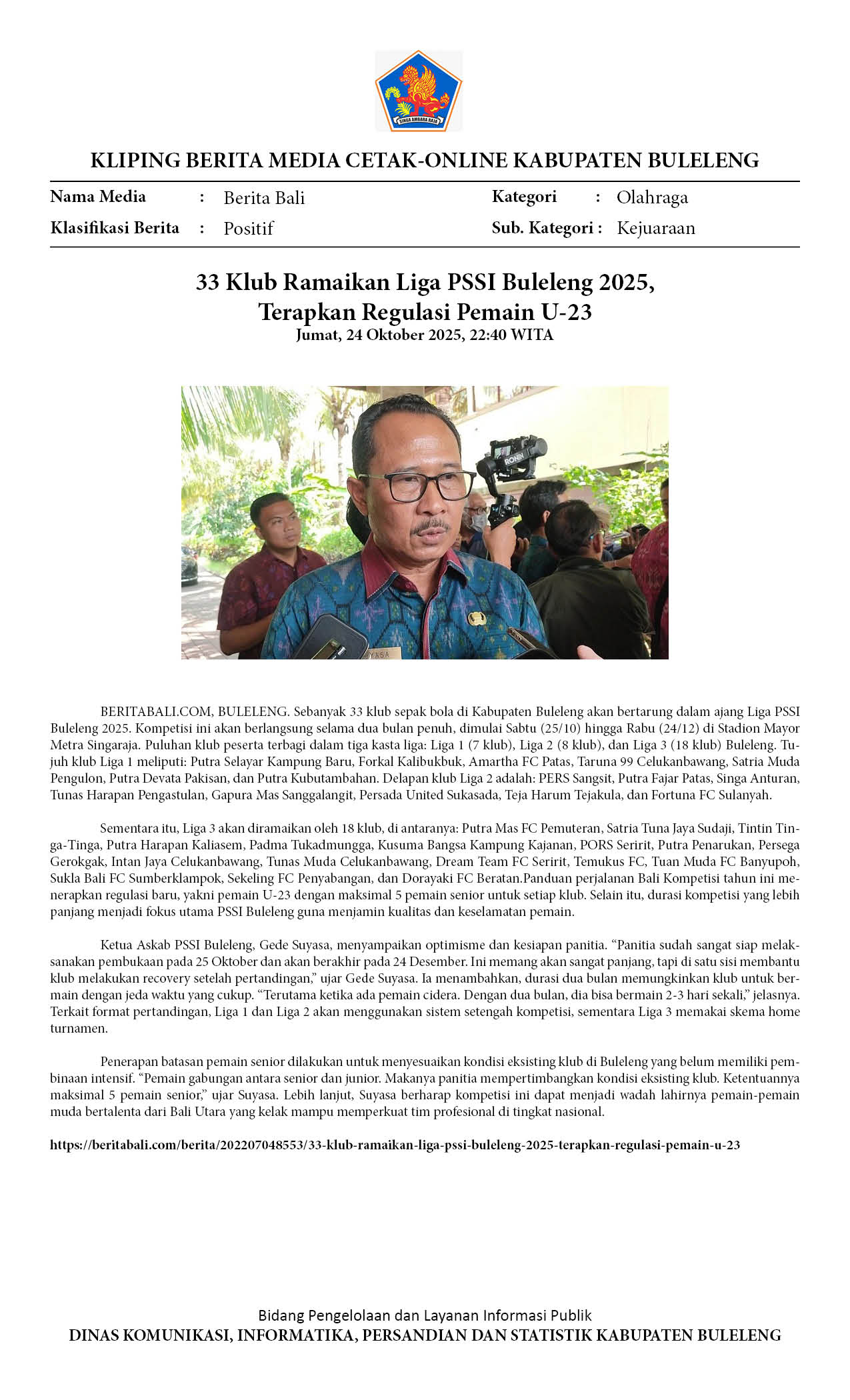 33 KLUB RAMAIKAN LIGA PSSI BULELENG 2025, TERAPKAN REGULASI PEMAIN U-23