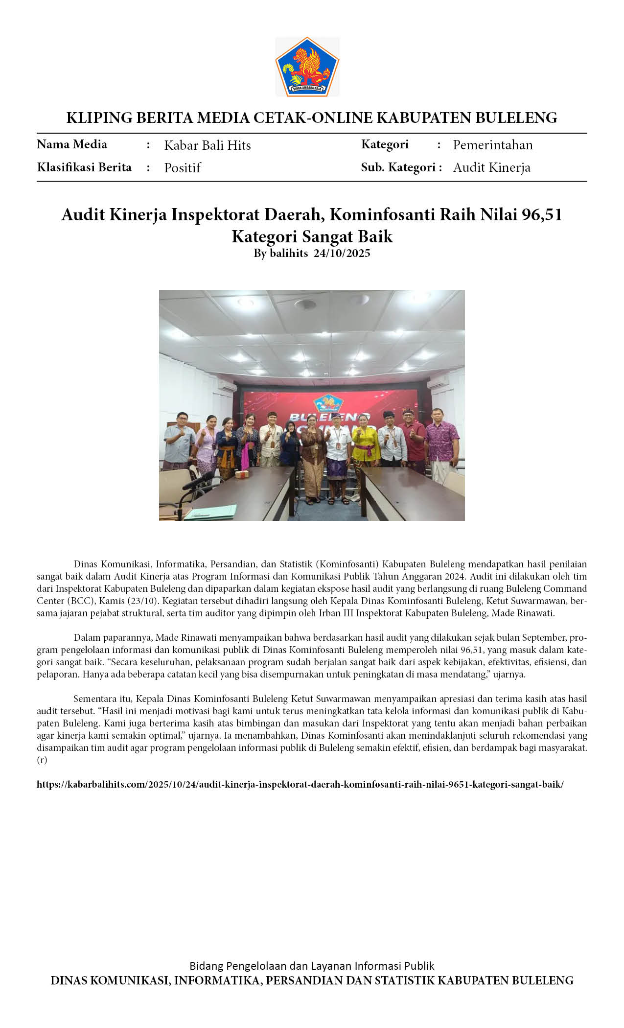 AUDIT KINERJA INSPEKTORAT DAERAH, KOMINFOSANTI RAIH NILAI 96,51 KATEGORI SANGAT BAIK
