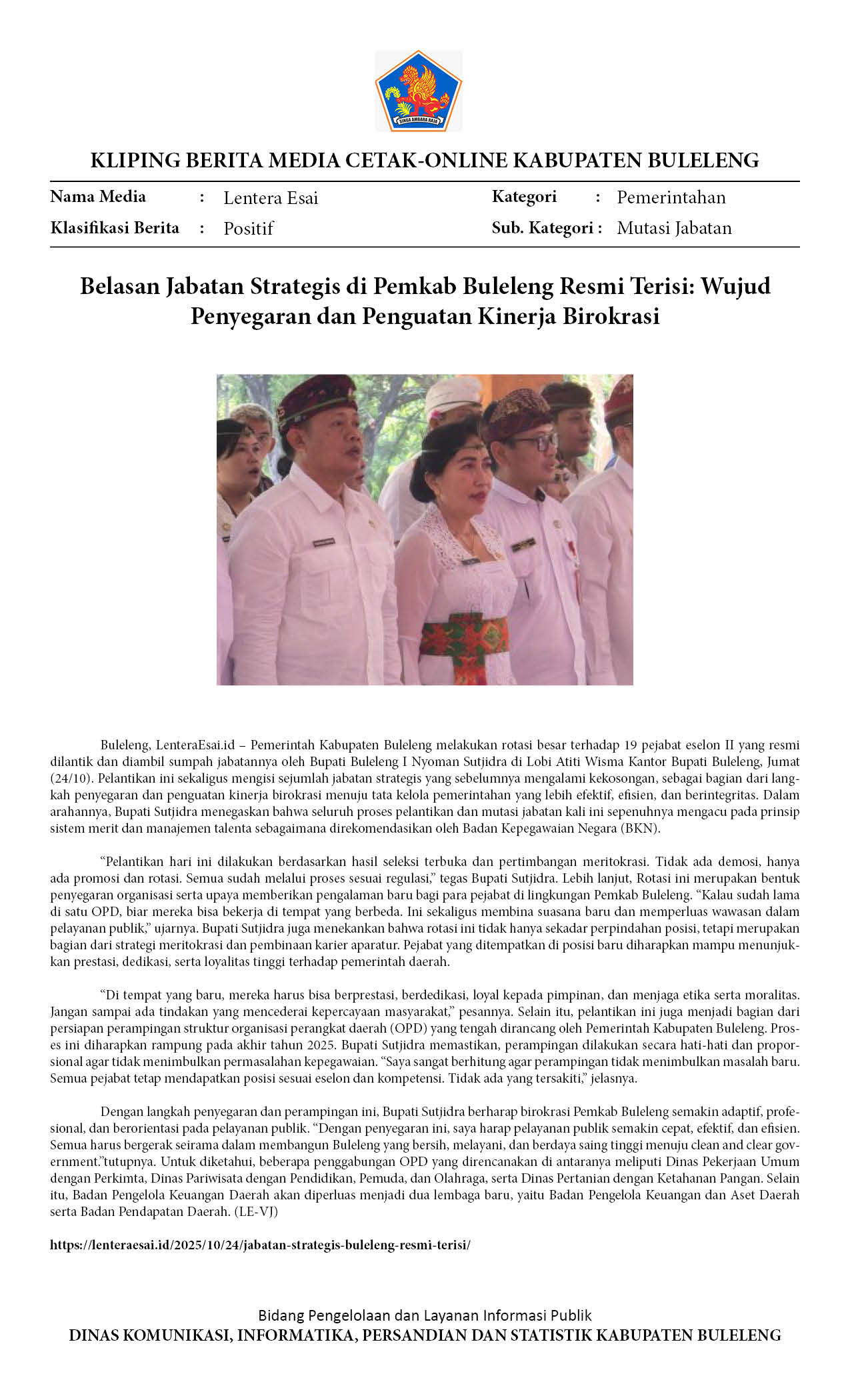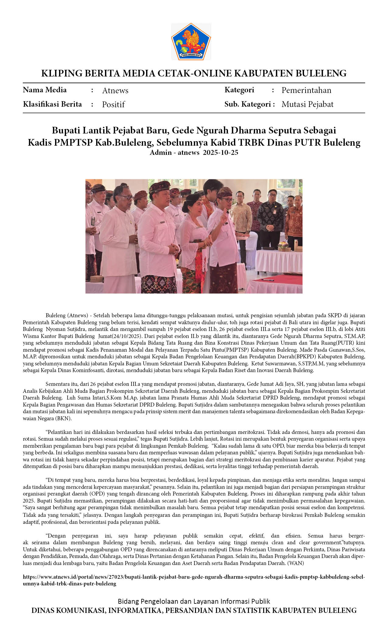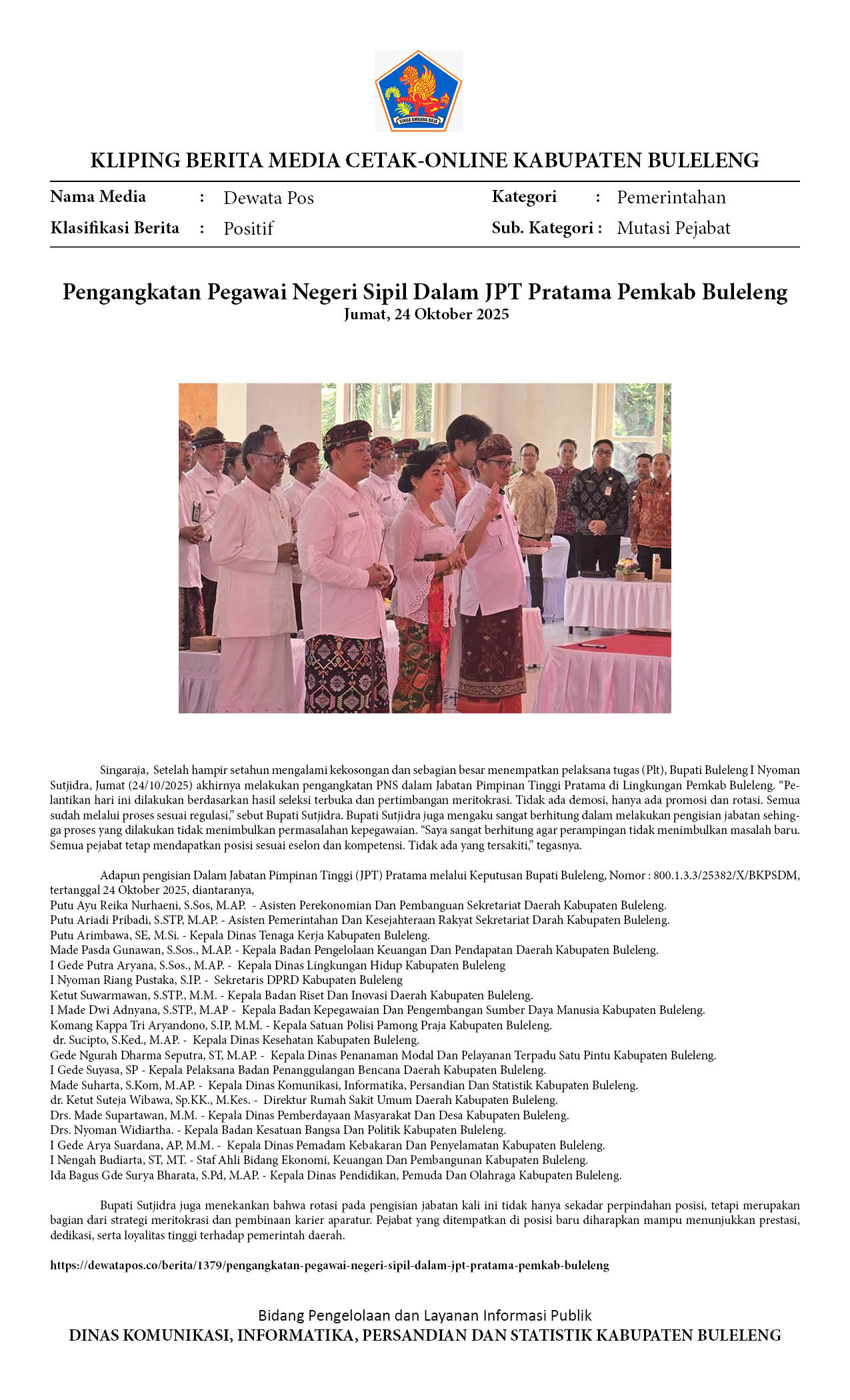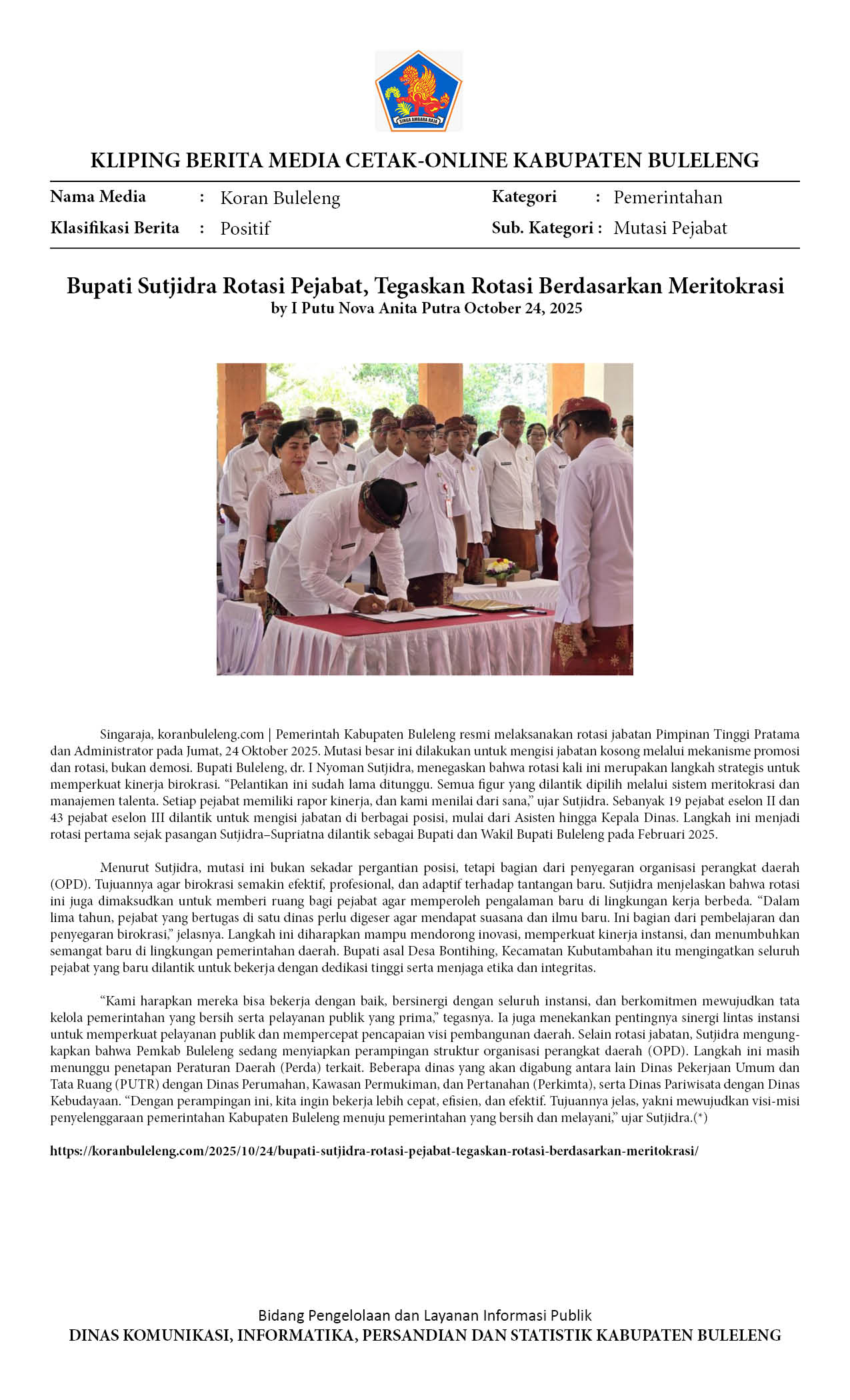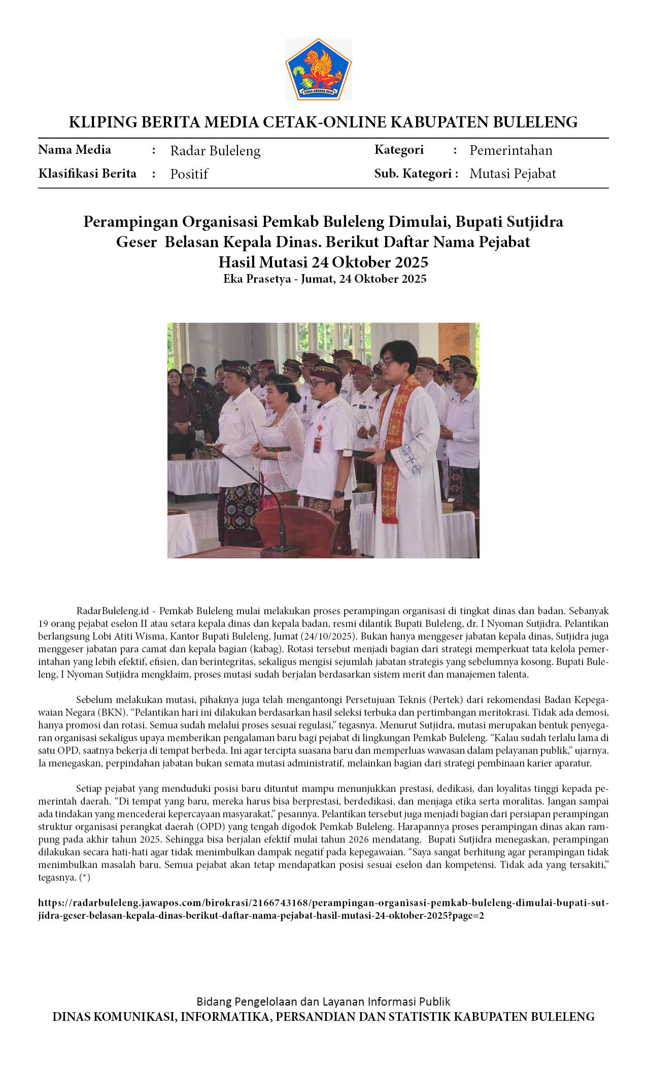 PERAMPINGAN ORGANISASI PEMKAB BULELENG DIMULAI, BUPATI SUTJIDRA GESER BELASAN KEPALA DINAS. BERIKUT DAFTAR NAMA PEJABAT HASIL MUTASI 24 OKTOBER 2025