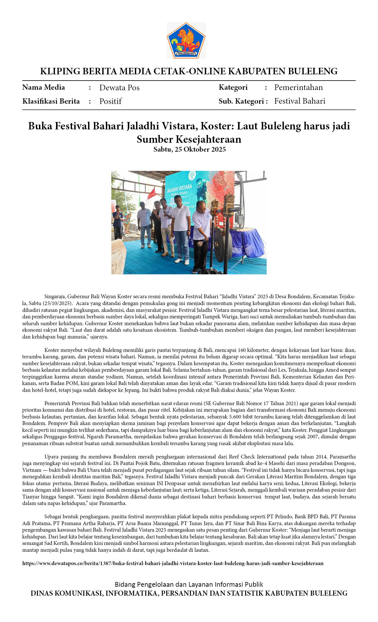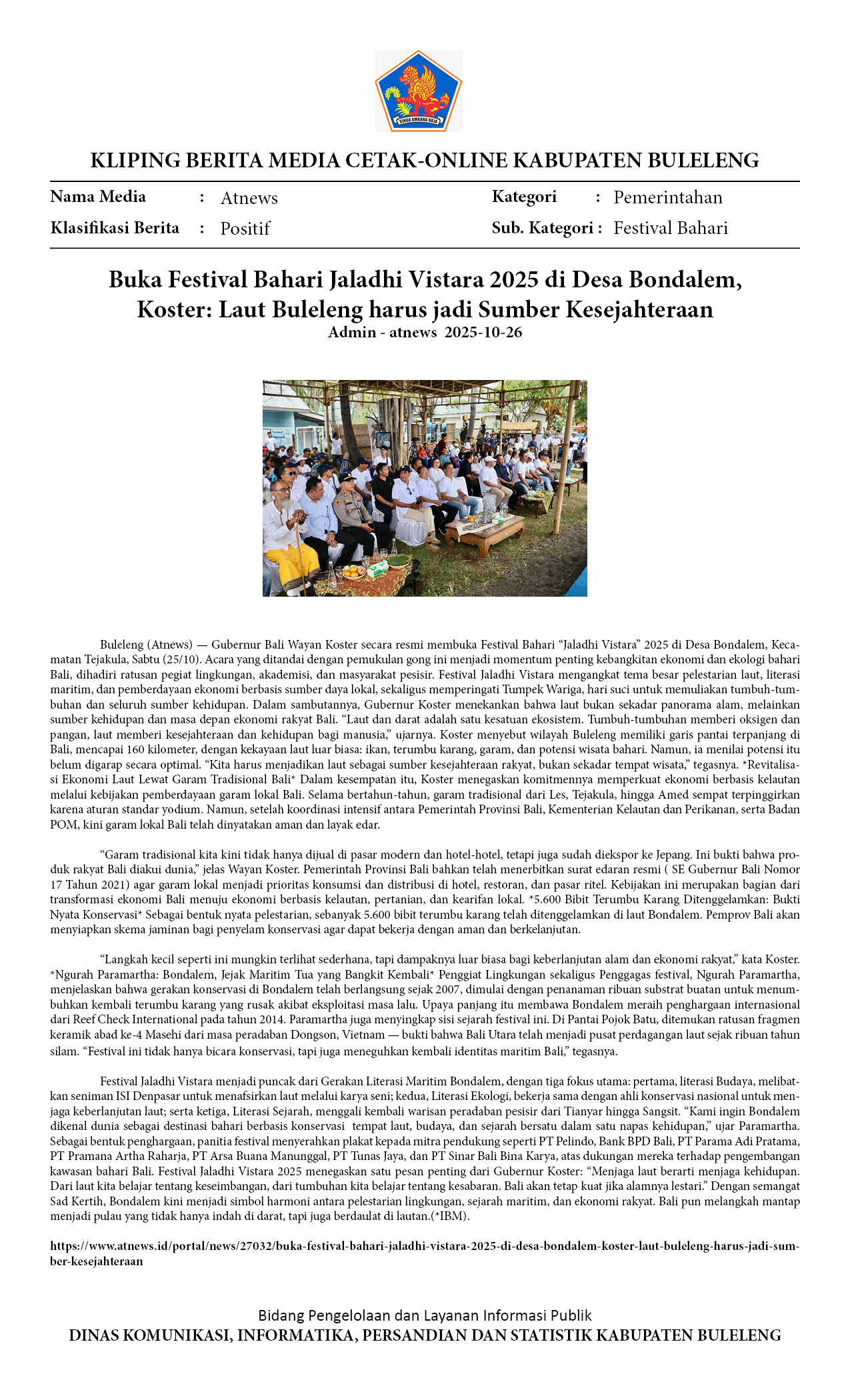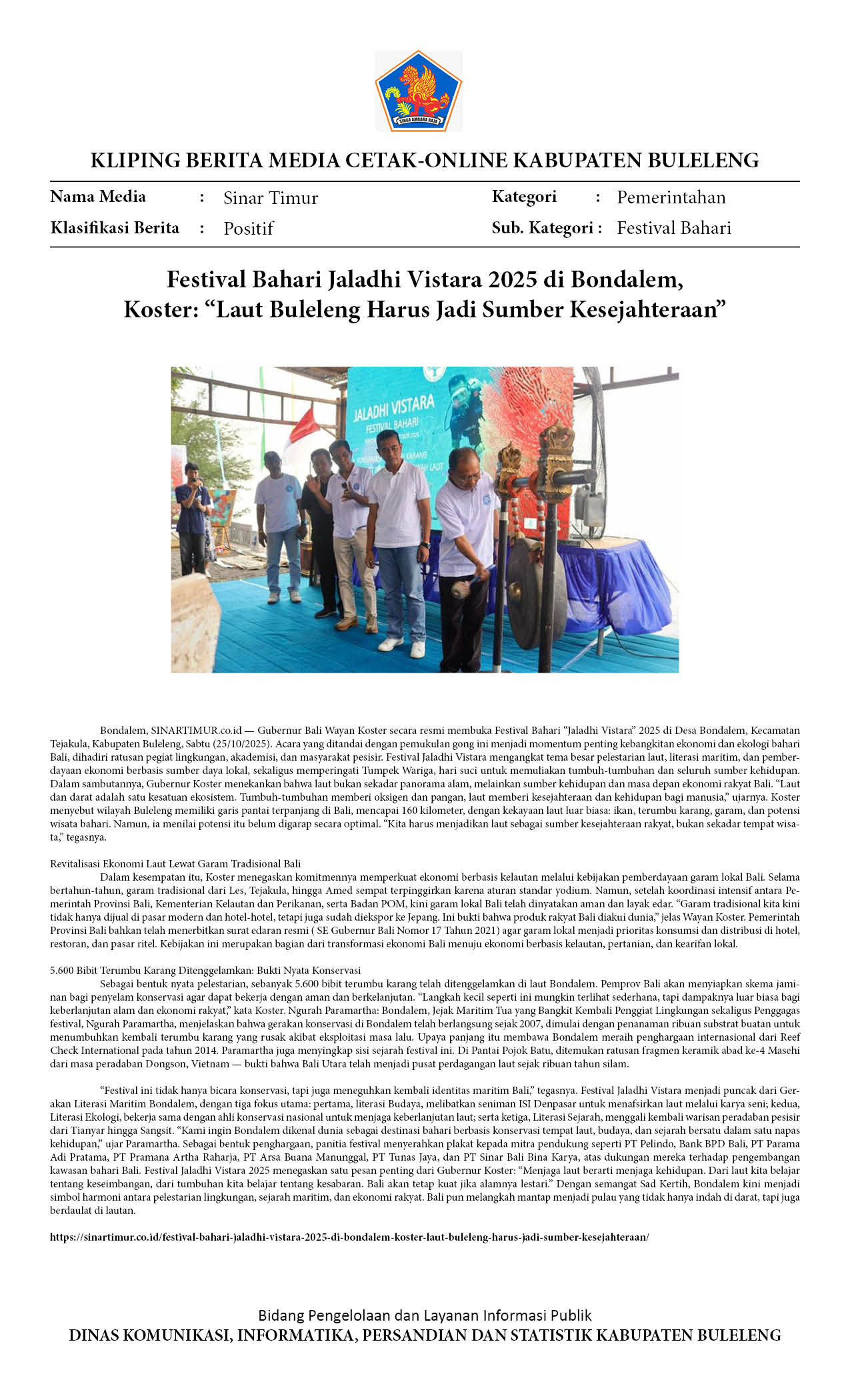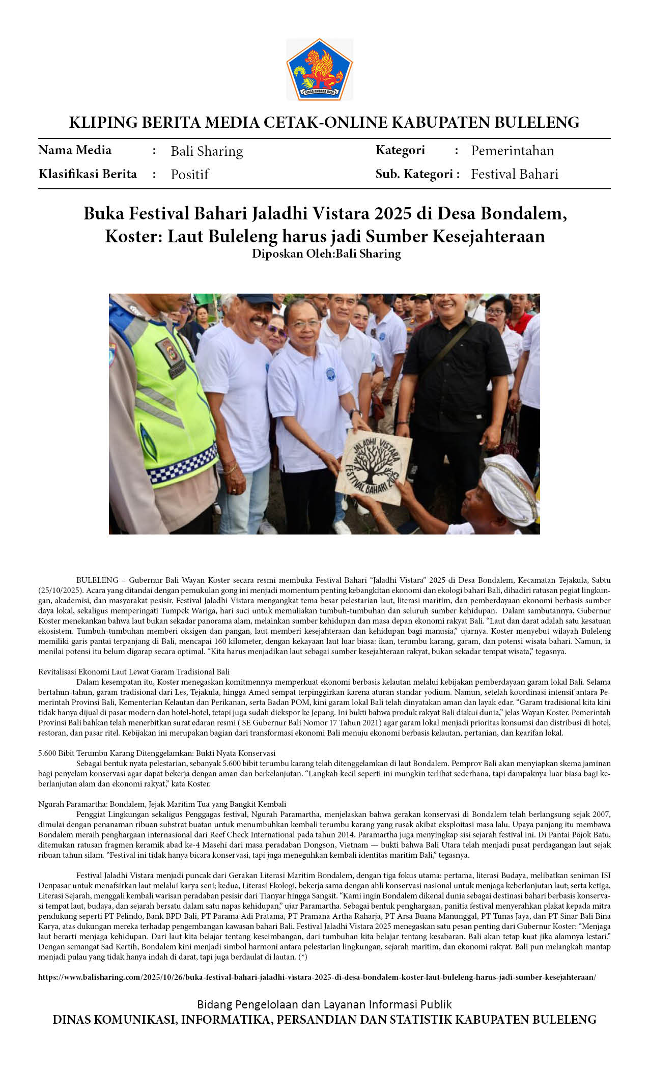 FESTIVAL BAHARI JALADHI VISTARA 2025 DI BONDALEM, KOSTER: “LAUT BULELENG HARUS JADI SUMBER KESEJAHTERAAN”