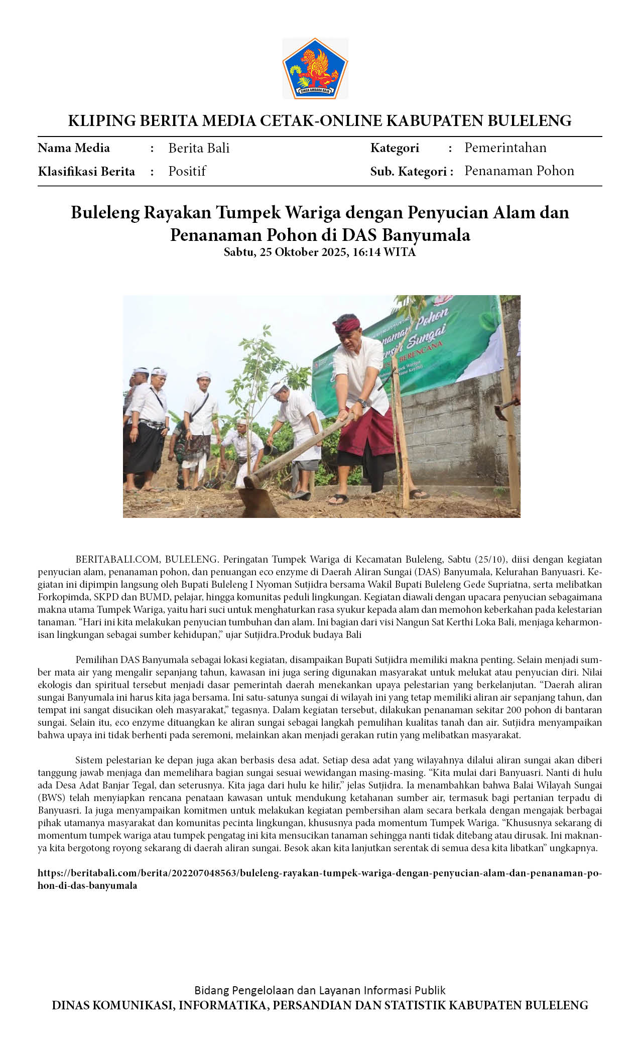 PEMKAB BULELENG GELAR GERAKAN PENANAMAN POHON DAN BERSIH SUNGAI SERENTAK DI MOMEN TUMPEK WARIGA