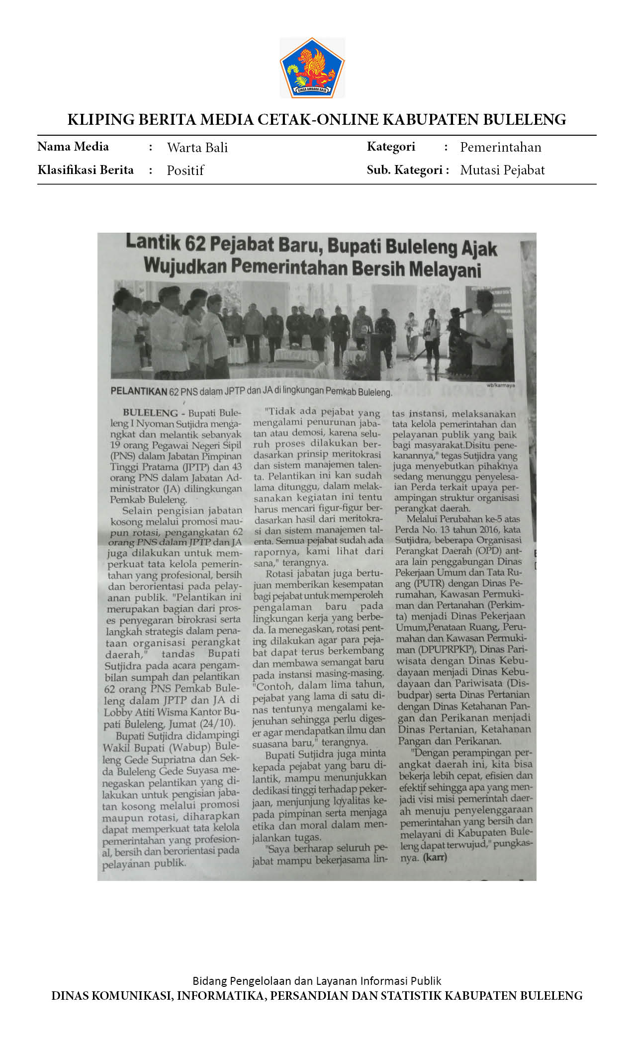 LANTIK 62 PEJABAT BARU, BUPATI BULELENG AJAK WUJUDKAN PEMERINTAHAN BERSIH MELAYANI