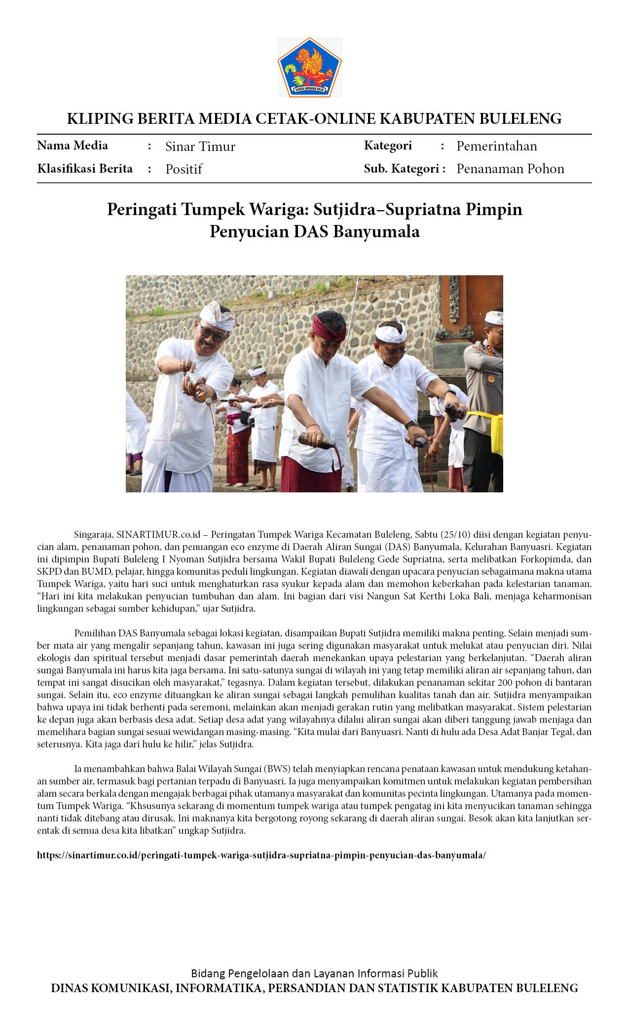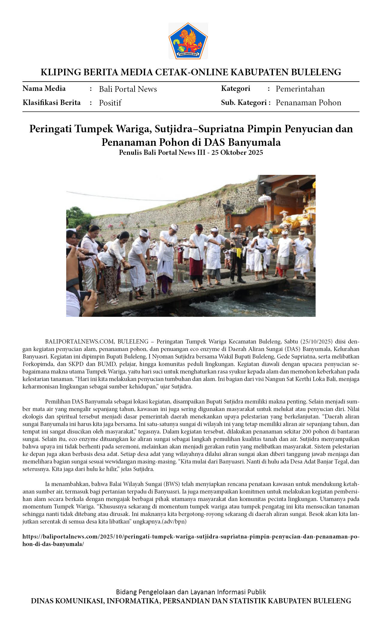 PERINGATI TUMPEK WARIGA, SUTJIDRA–SUPRIATNA PIMPIN PENYUCIAN DAN PENANAMAN POHON DI DAS BANYUMALA