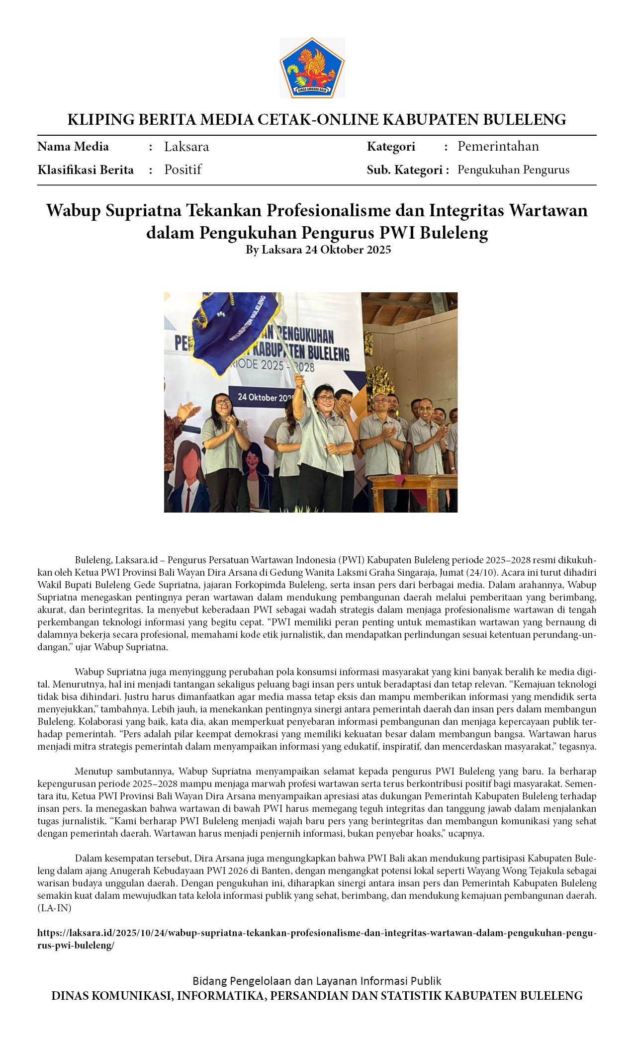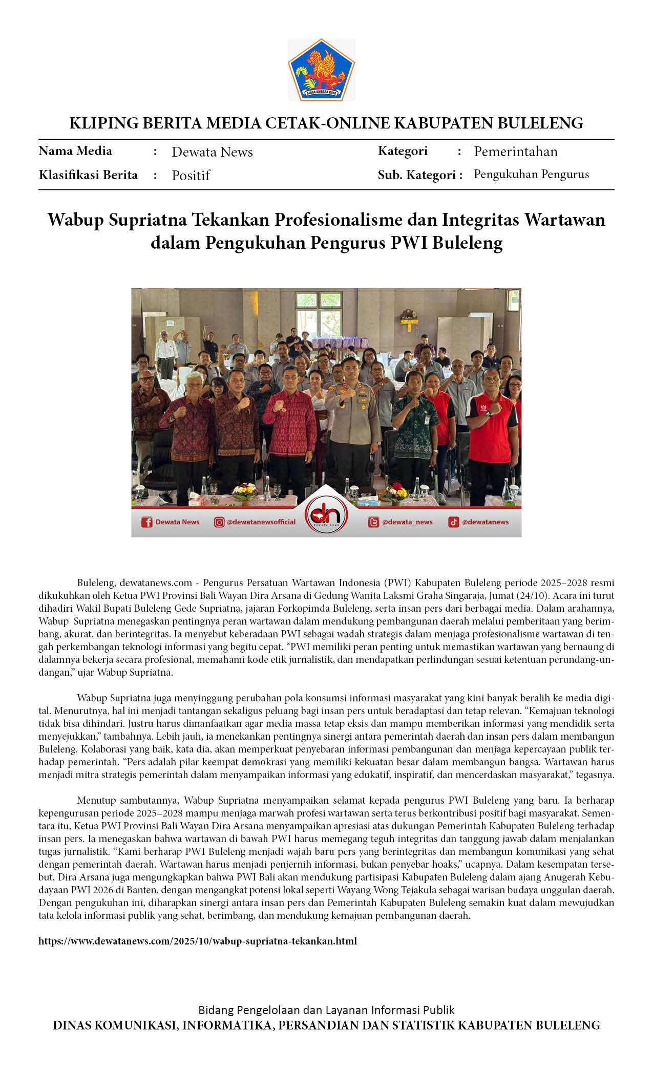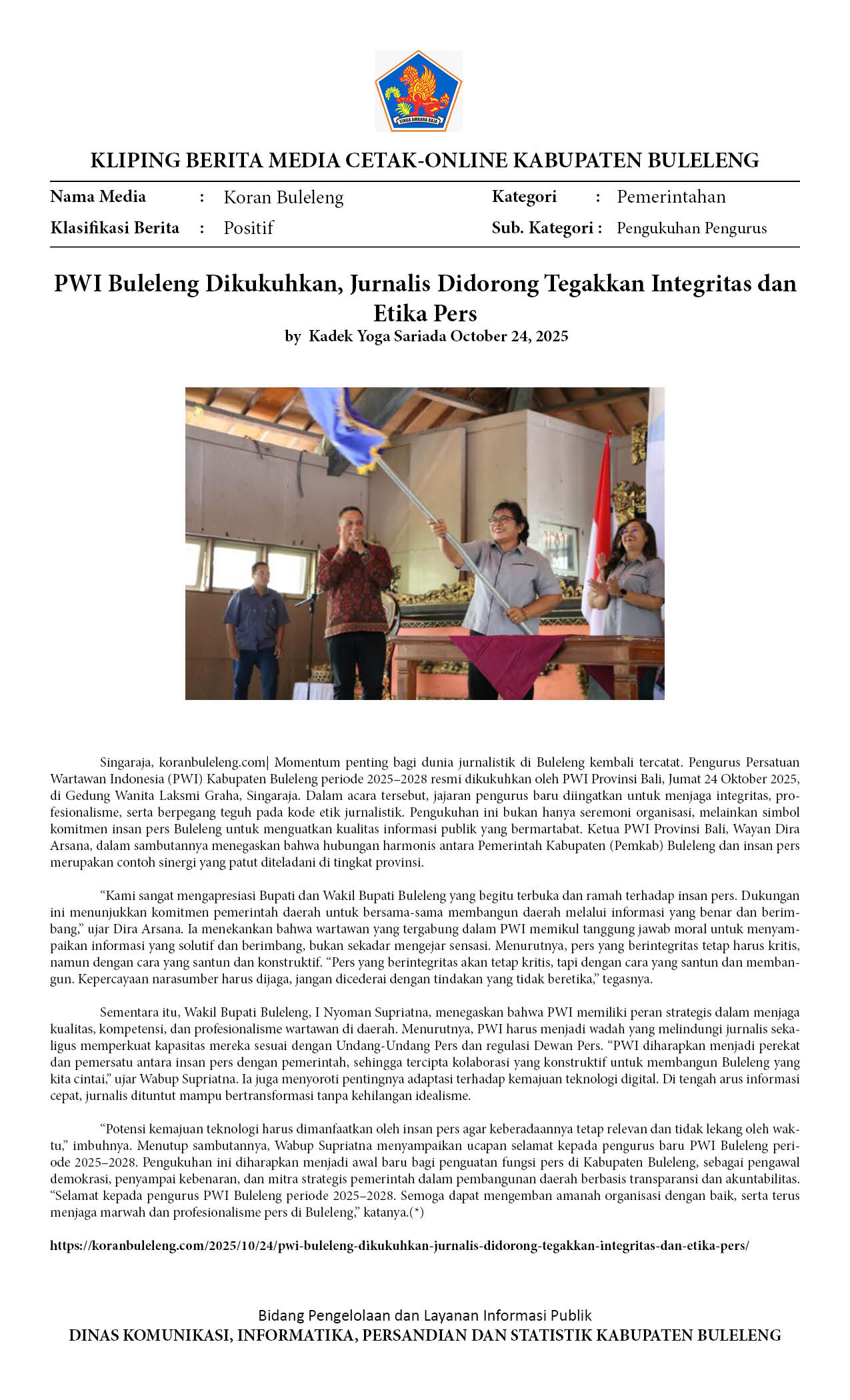PENGURUS PWI BULELENG DIKUKUHKAN, WABUP SUPRIATNA TEKANKAN PROFESIONALISME DAN INTEGRITAS WARTAWAN