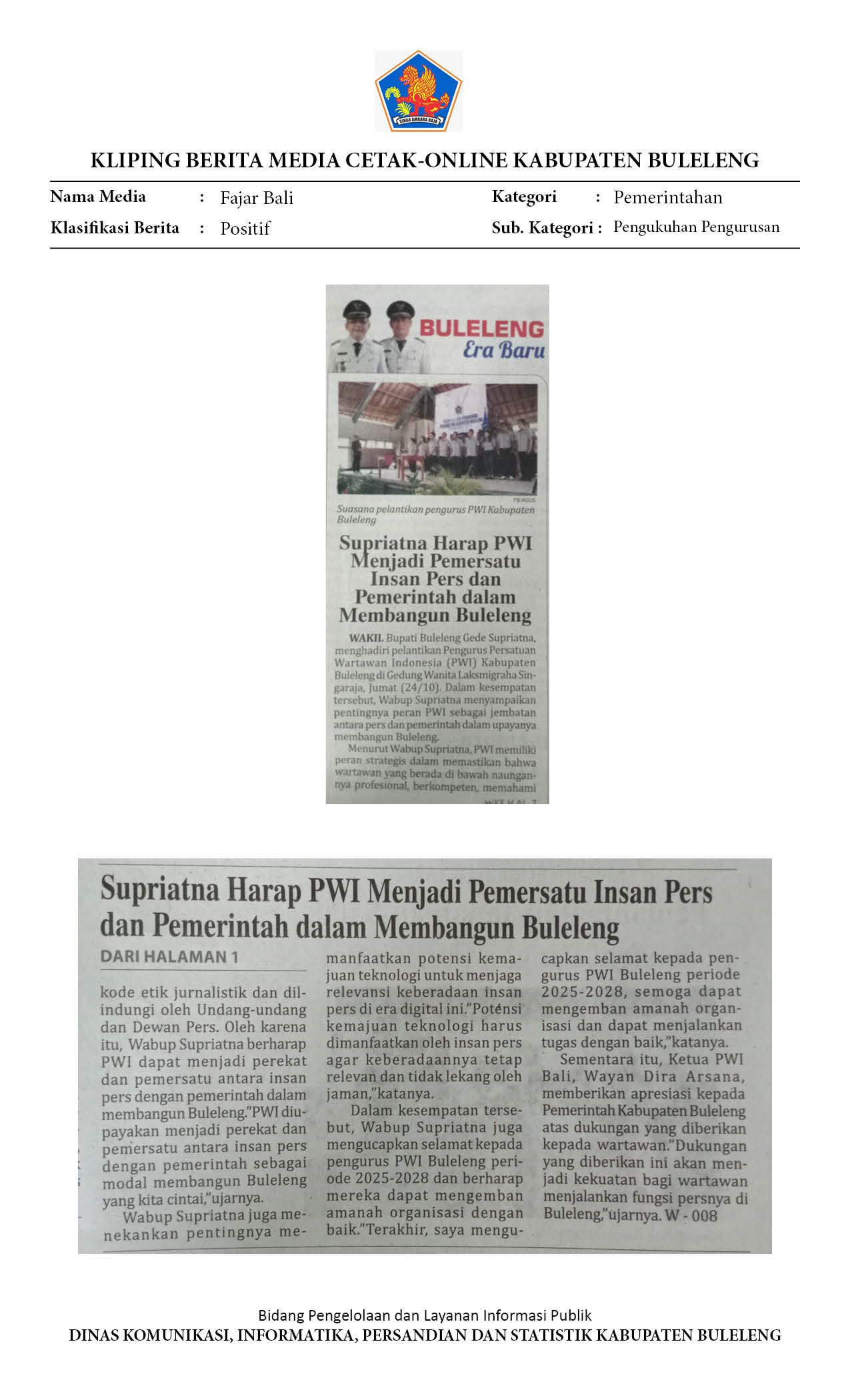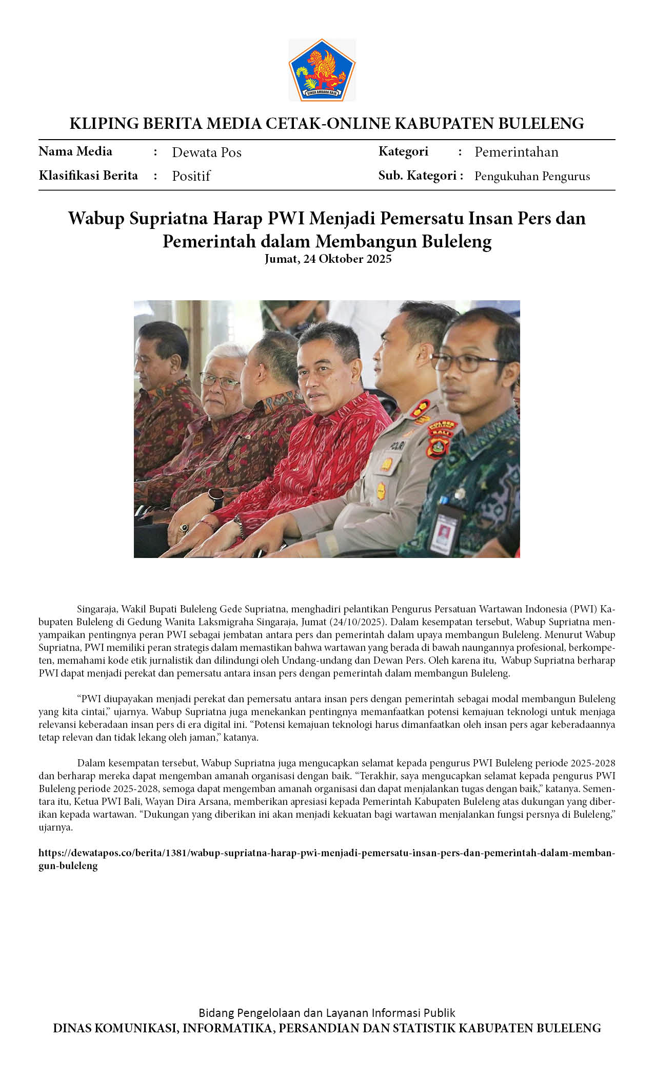 WABUP SUPRIATNA HADIRI PELANTIKAN PENGURUS PWI KABUPATEN BULELENG, DORONG SINERGI PERS DAN PEMERINTAH BANGUN BULELENG