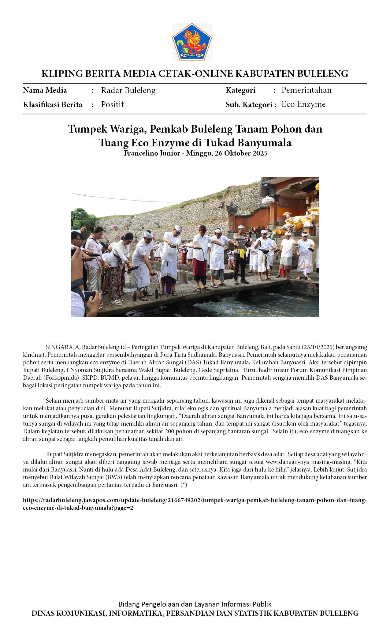 TUMPEK WARIGA, PEMKAB BULELENG TANAM POHON DAN TUANG ECO ENZYME DI TUKAD BANYUMALA