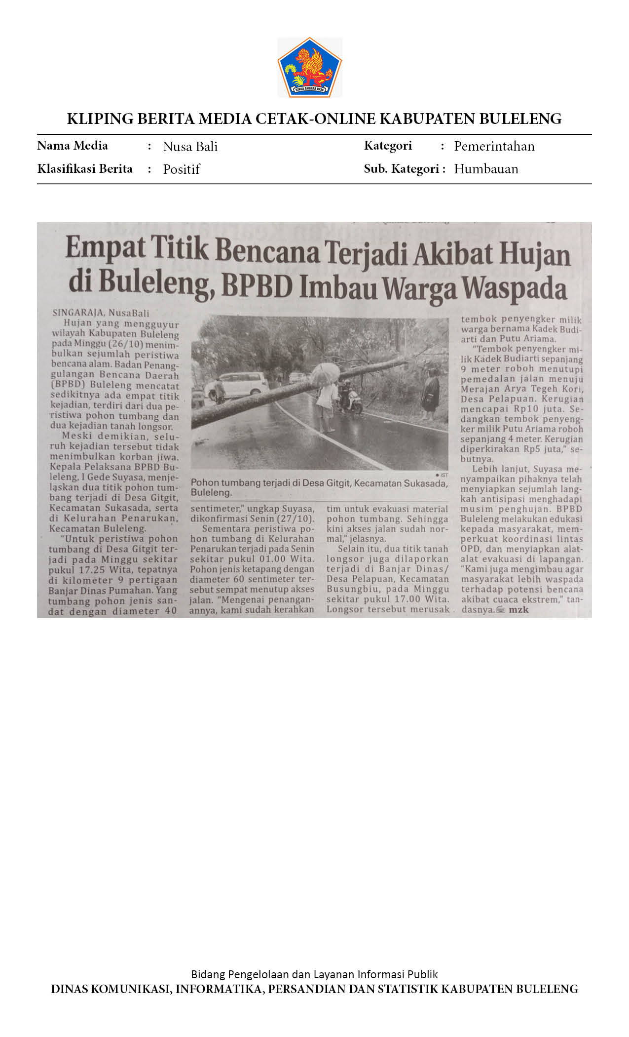 EMPAT TITIK BENCANA TERJADI AKIBAT HUJAN DI BULELENG, BPBD IMBAU WARGA WASPADA