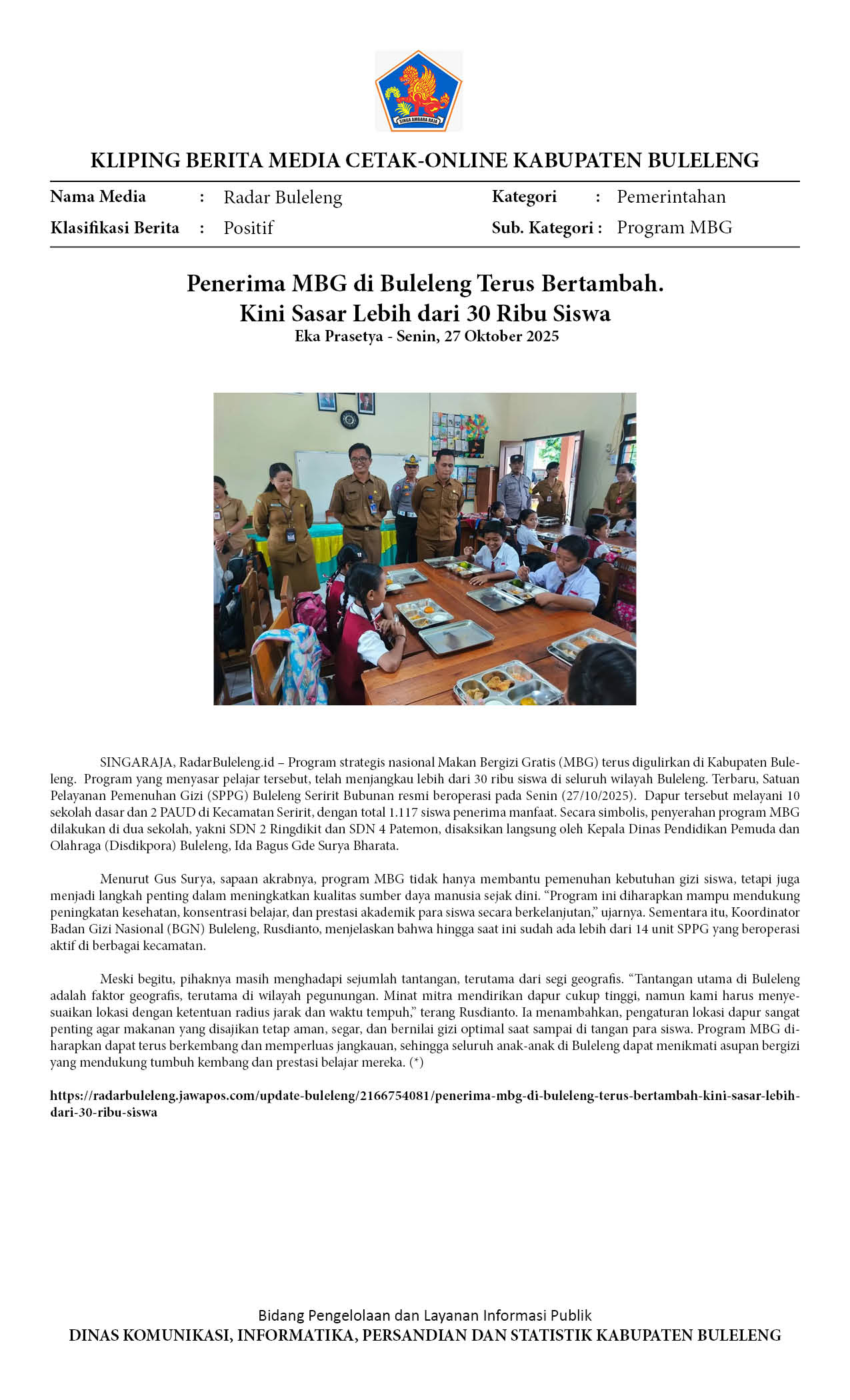 PENERIMA MBG DI BULELENG TERUS BERTAMBAH. KINI SASAR LEBIH DARI 30 RIBU SISWA