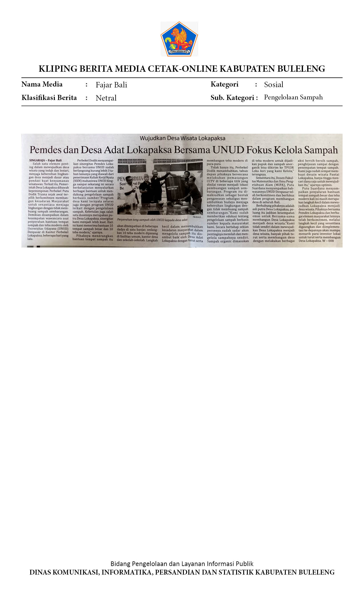 PEMDES DAN DESA ADAT LOKAPAKSA BERSAMA UNUD FOKUS KELOLA SAMPAH