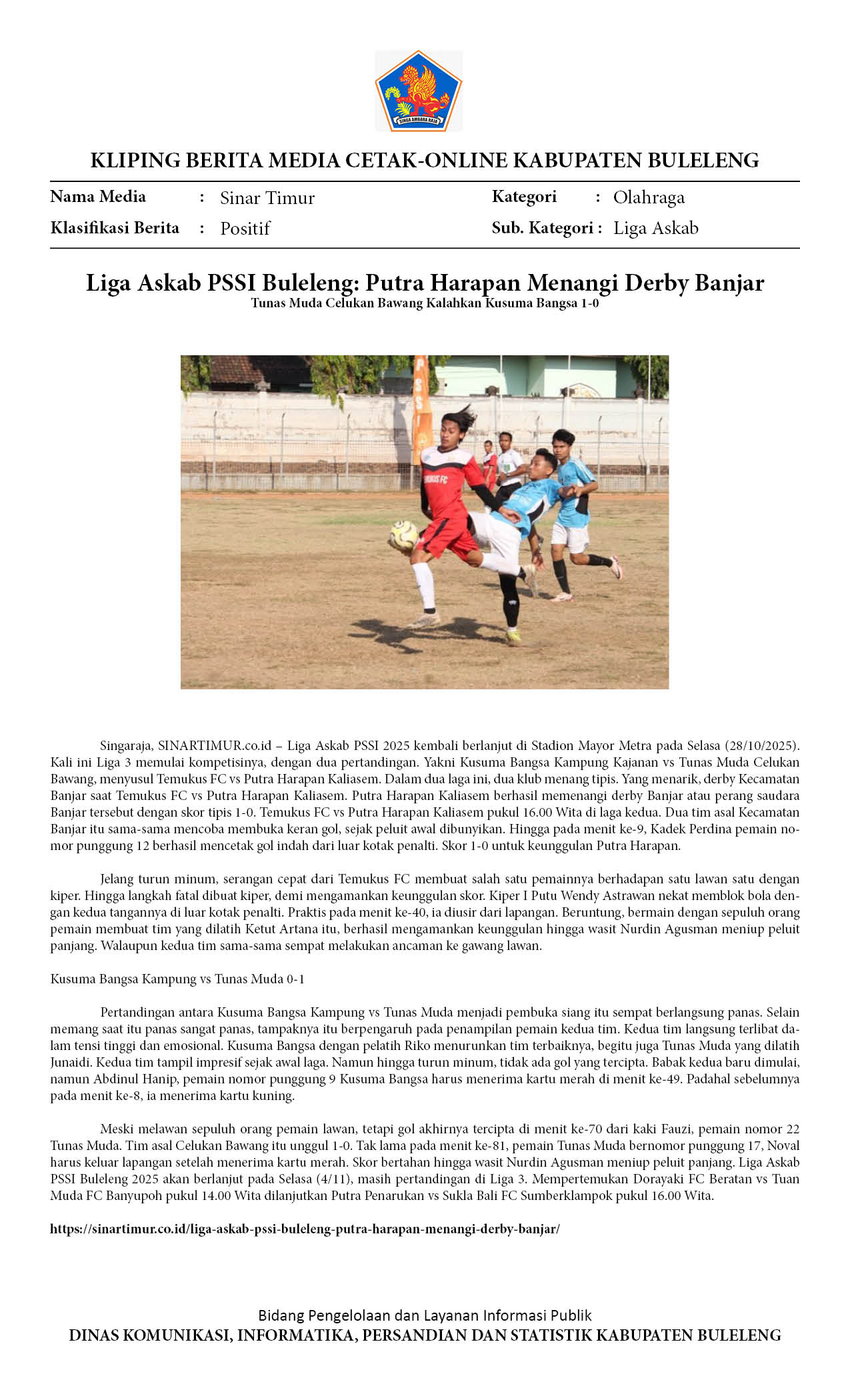 LIGA ASKAB PSSI BULELENG: PUTRA HARAPAN MENANGI DERBY BANJAR