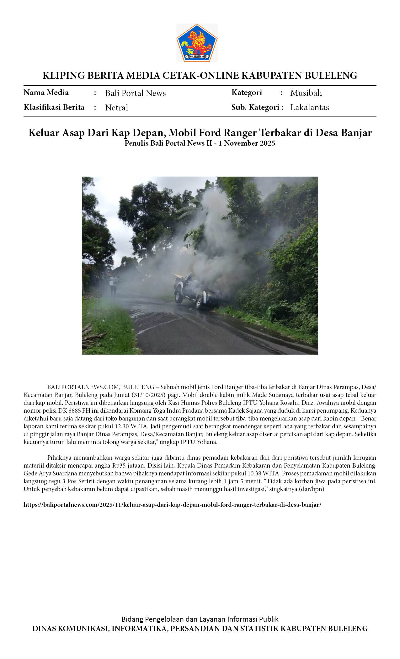 KELUAR ASAP DARI KAP DEPAN, MOBIL FORD RANGER TERBAKAR DI DESA BANJAR