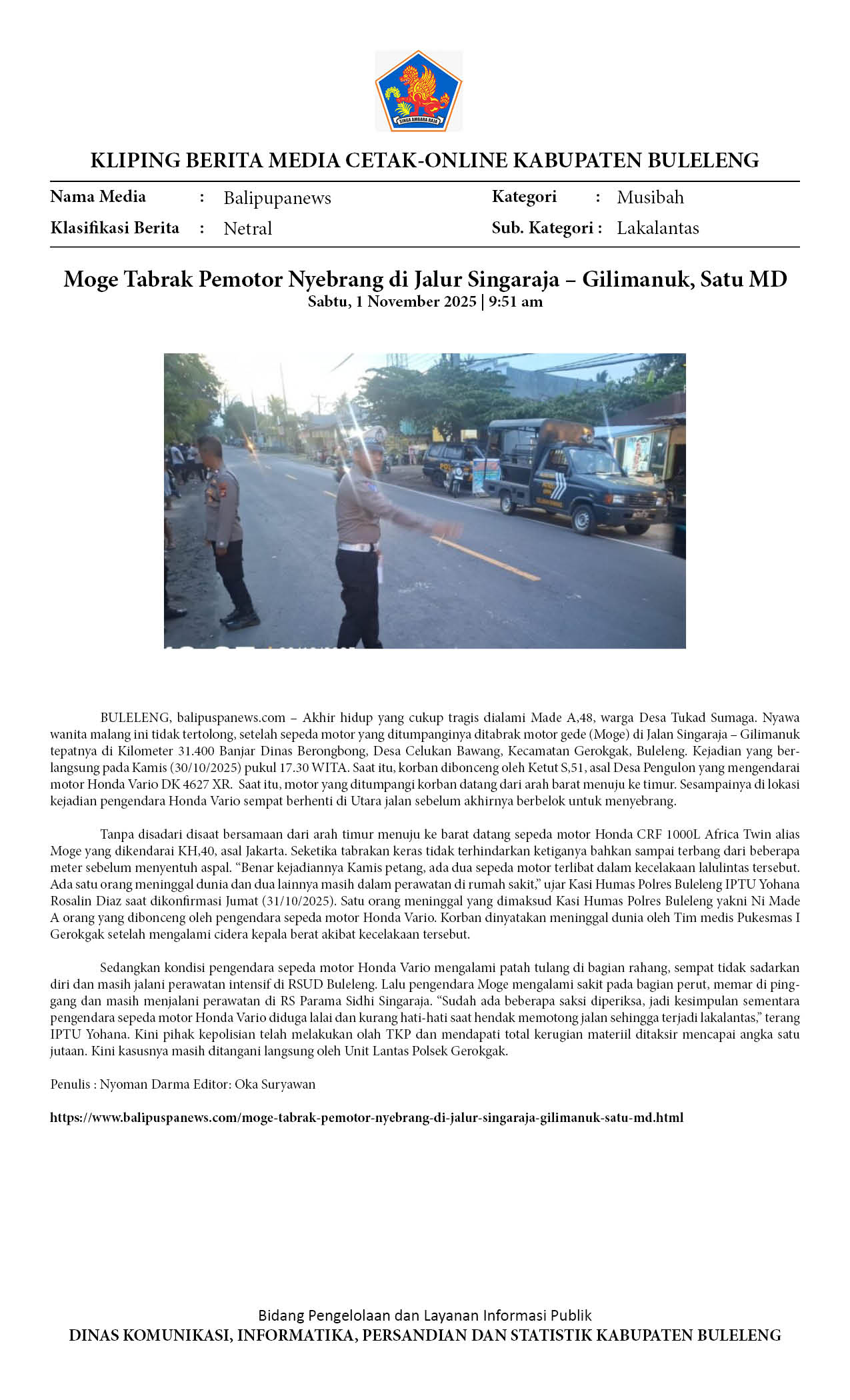 VARIO DITABRAK MOGE DI GEROKGAK, SATU MEREGANG NYAWA