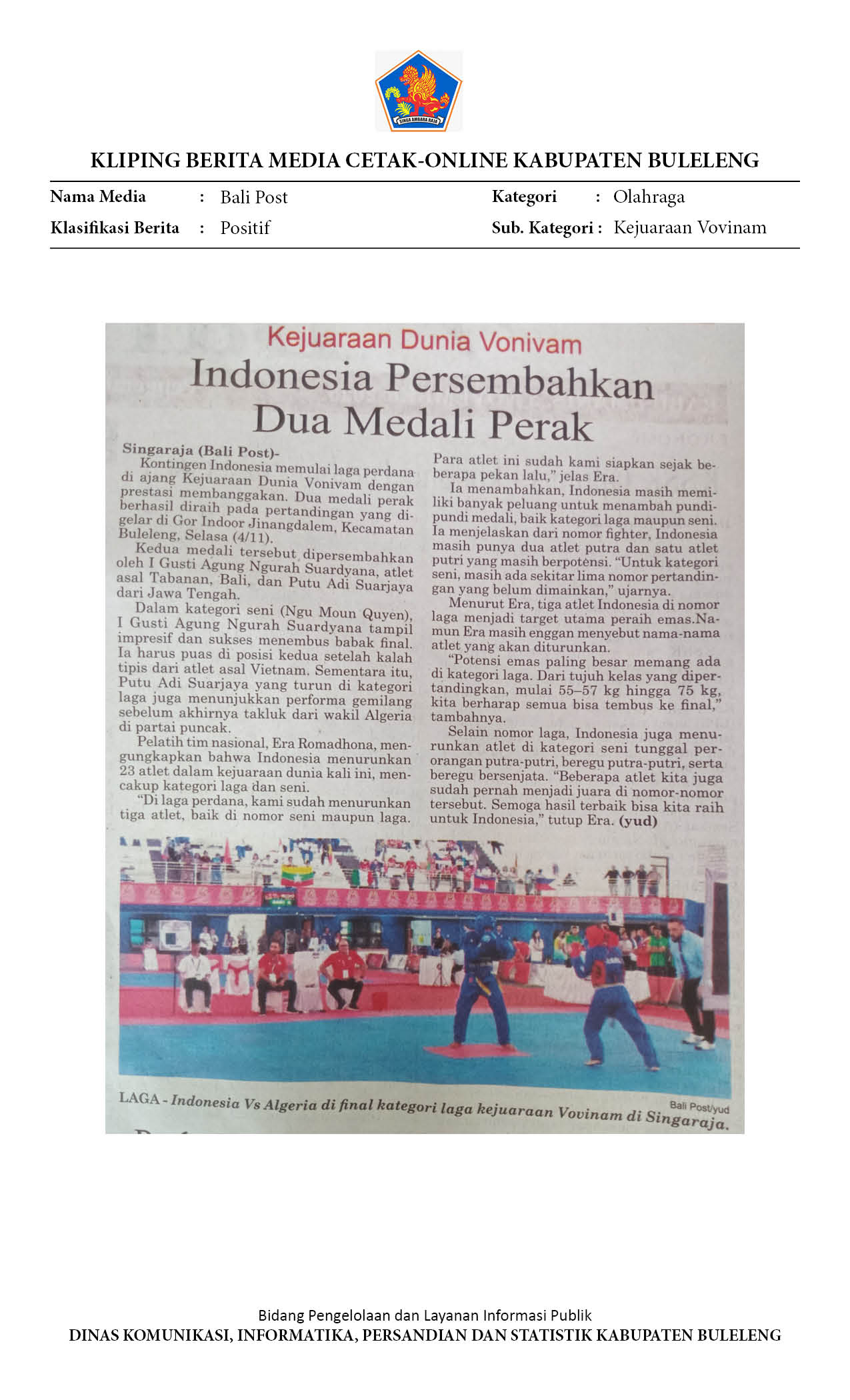 KEJUARAAN DUNIA VOVINAM, INDONESIA MAMPU RAIH PERAK DAN PERUNGGU DI HARI PERTAMA