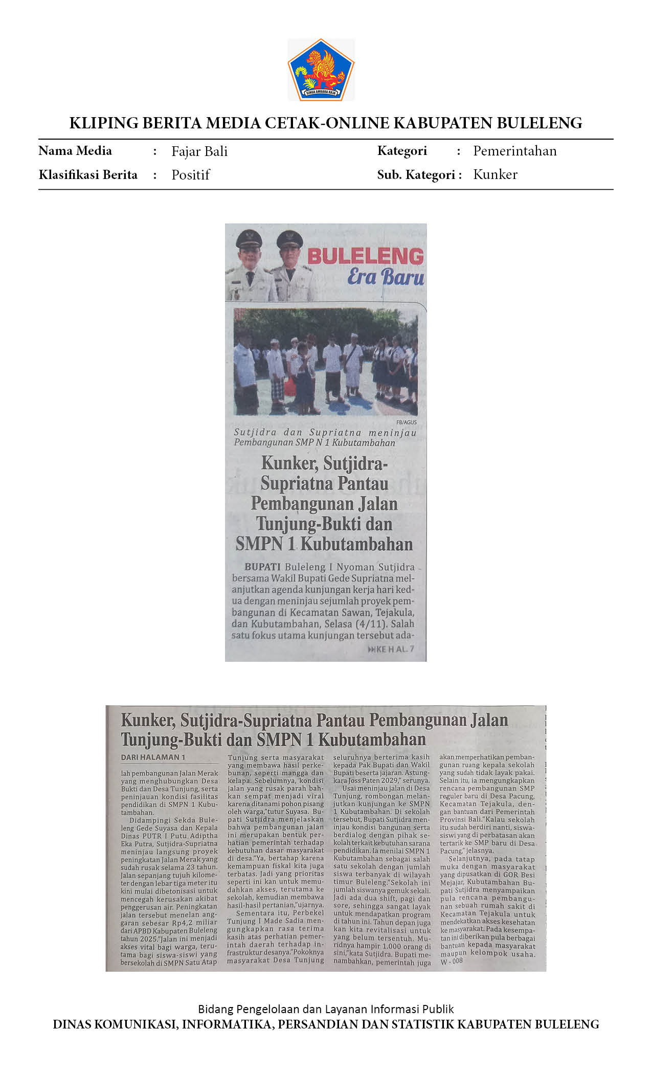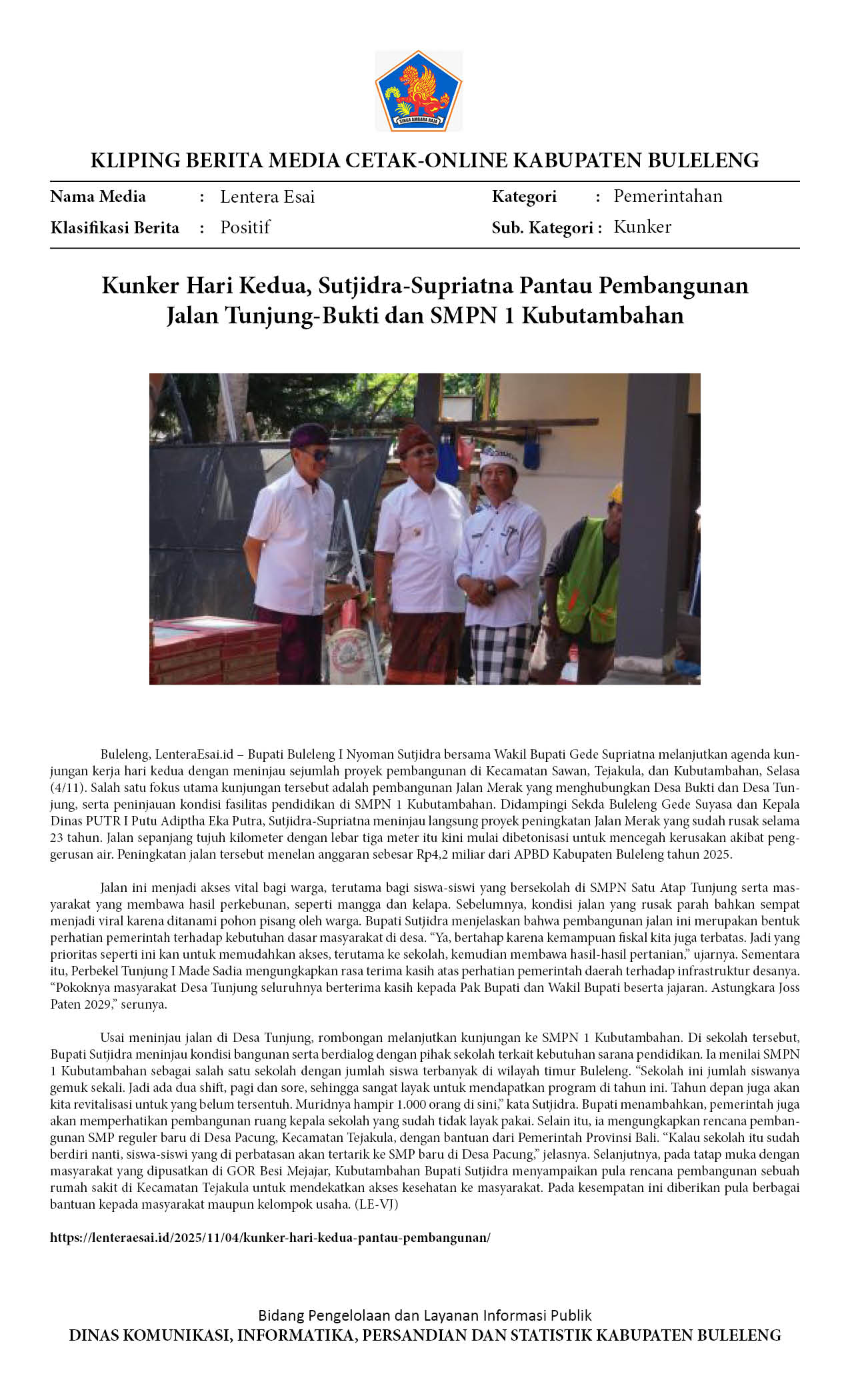 KUNKER, SUTJIDRA-SUPRIATNA PANTAU PEMBANGUNANJALAN TUNJUNG-BUKTI DAN SMPN 1 KUBUTAMBAHAN