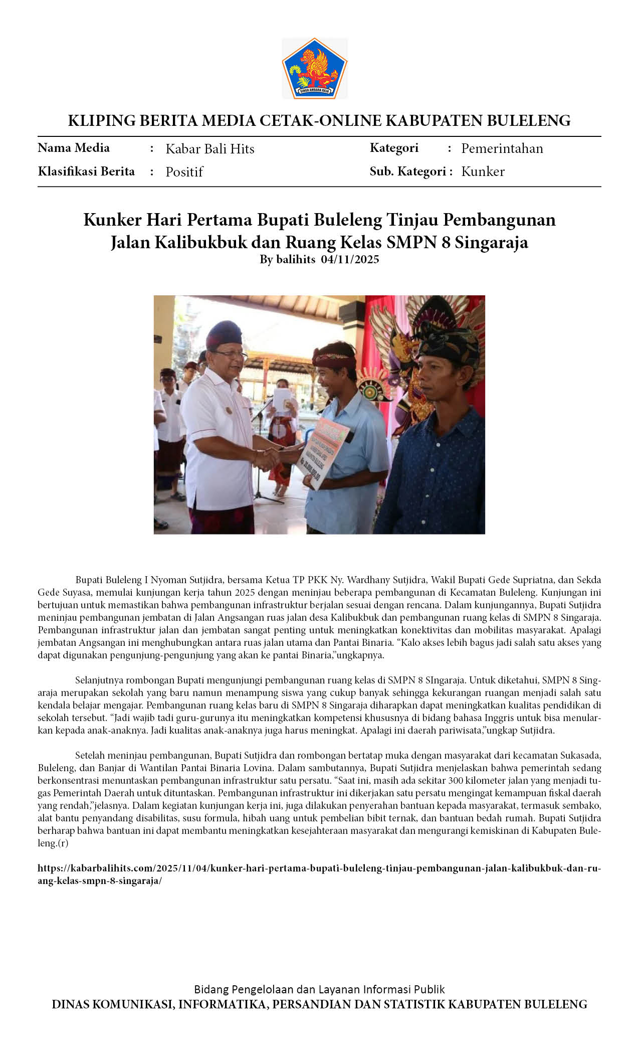 KUNKER HARI PERTAMA BUPATI BULELENG TINJAU PEMBANGUNAN JALAN KALIBUKBUK DAN RUANG KELAS SMPN 8 SINGARAJA