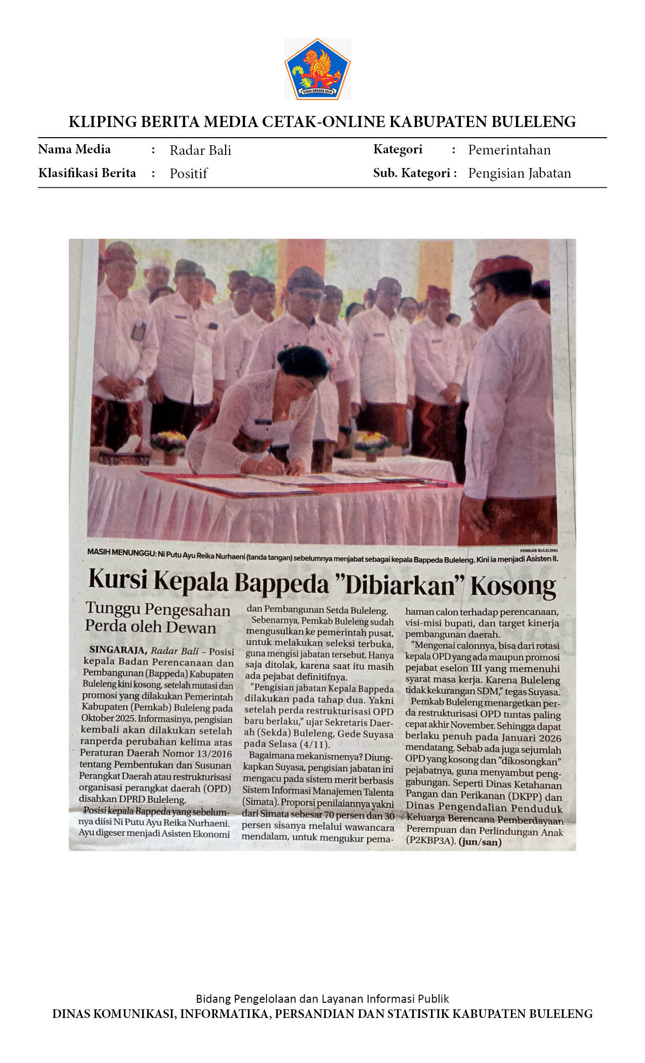 KURSI KEPALA BAPPEDA BULELENG MASIH KOSONG, PENGISIAN TUNGGU PERDA OPD DISAHKAN