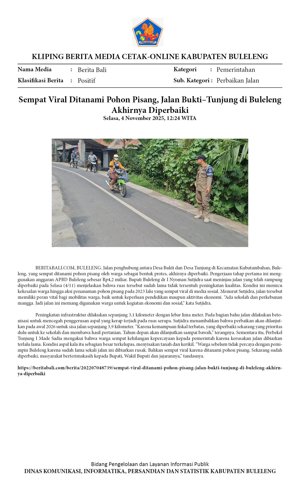 SEMPAT VIRAL DITANAMI POHON PISANG, JALAN BUKTI–TUNJUNG DI BULELENG AKHIRNYA DIPERBAIKI