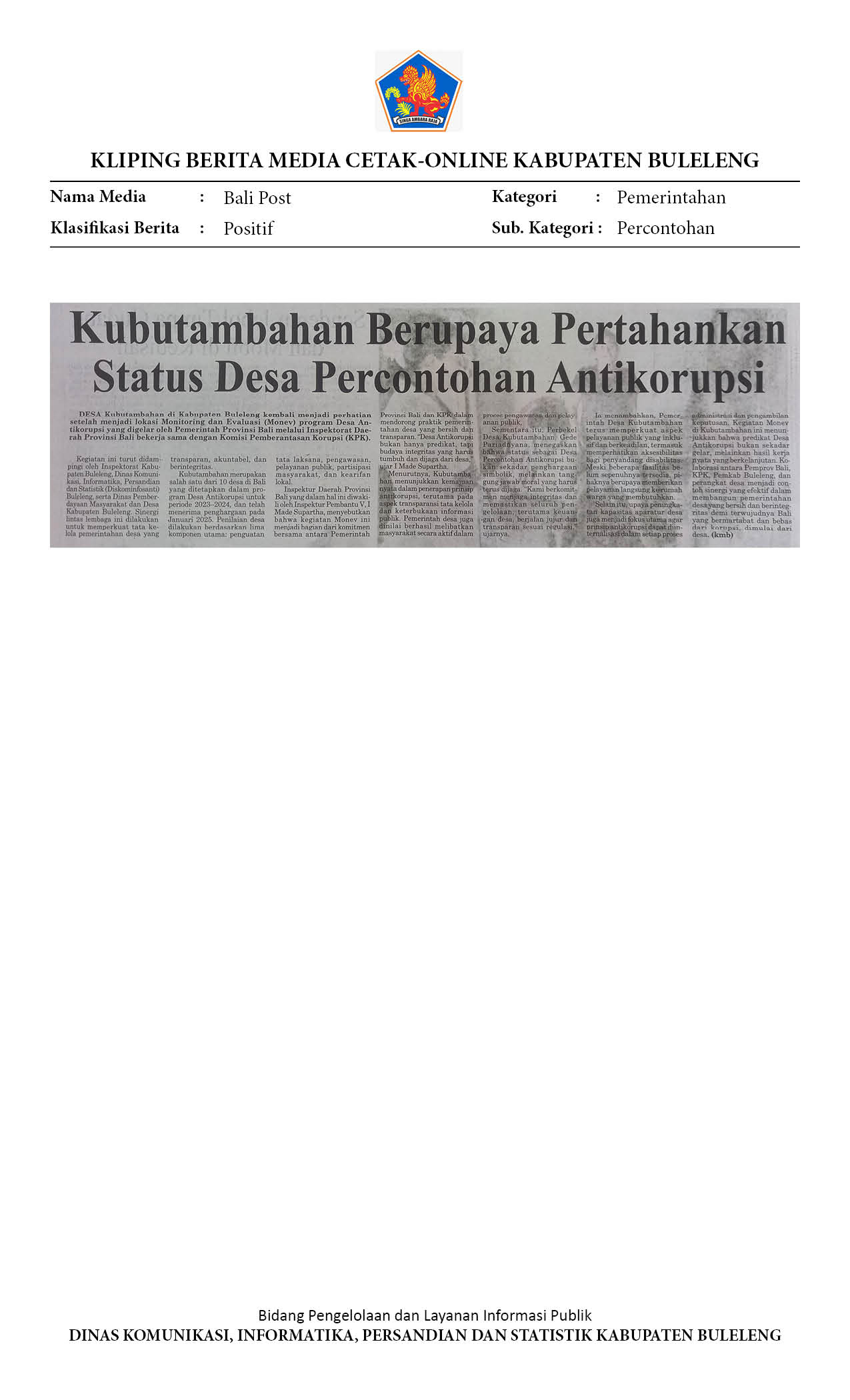 KUBUTAMBAHAN BERUPAYA PERTAHANKAN STATUS DESA PERCONTOHAN ANTIKORUPSI