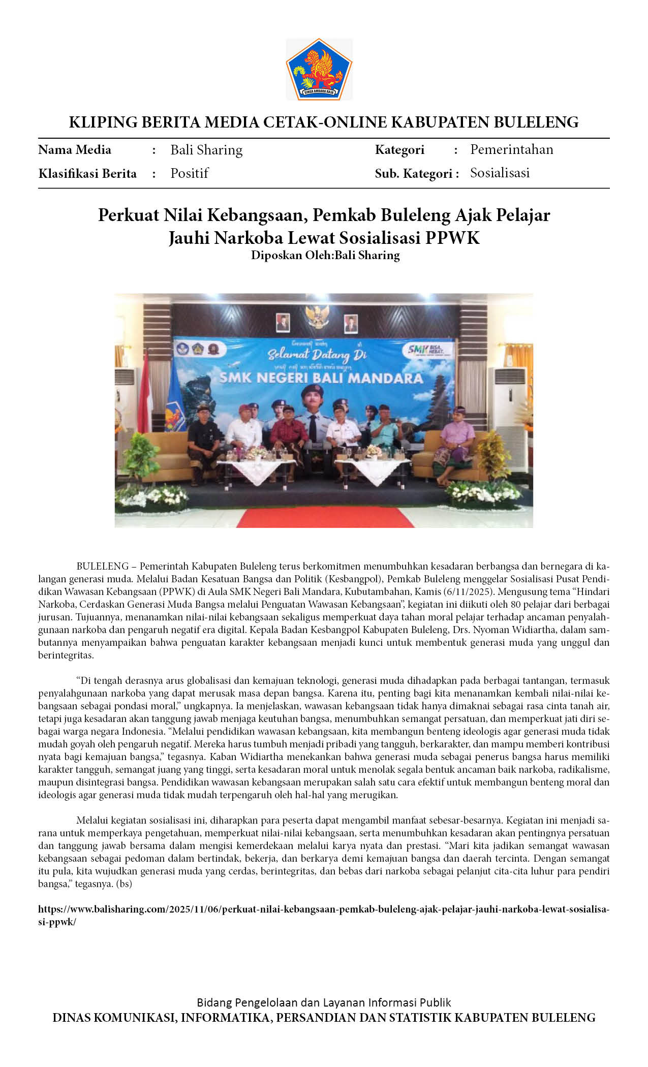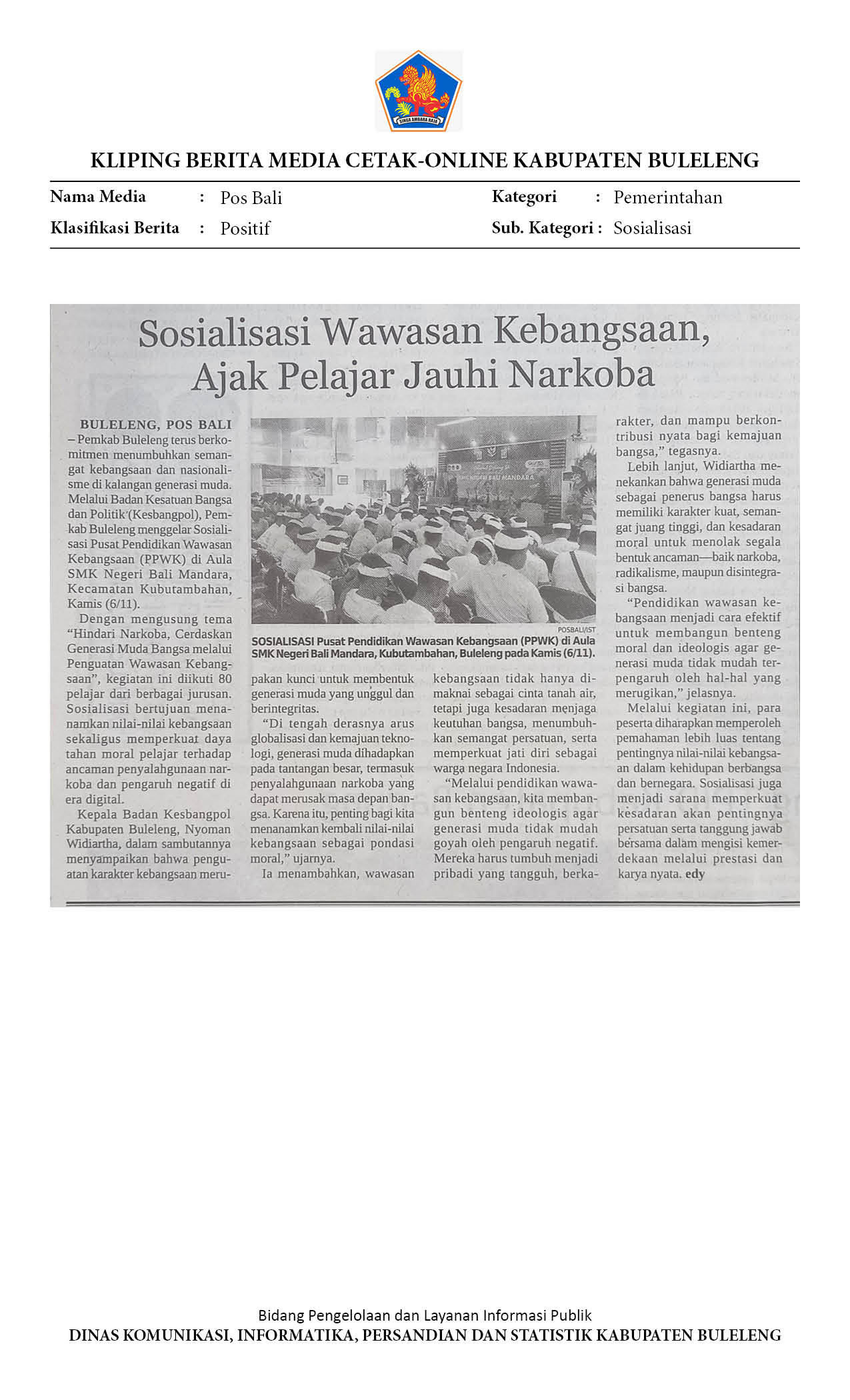 WUJUDKAN GENERASI CERDAS DAN BERINTEGRITAS, PEMKAB BULELENG GENCARKAN PENDIDIKAN WAWASAN KEBANGSAAN
