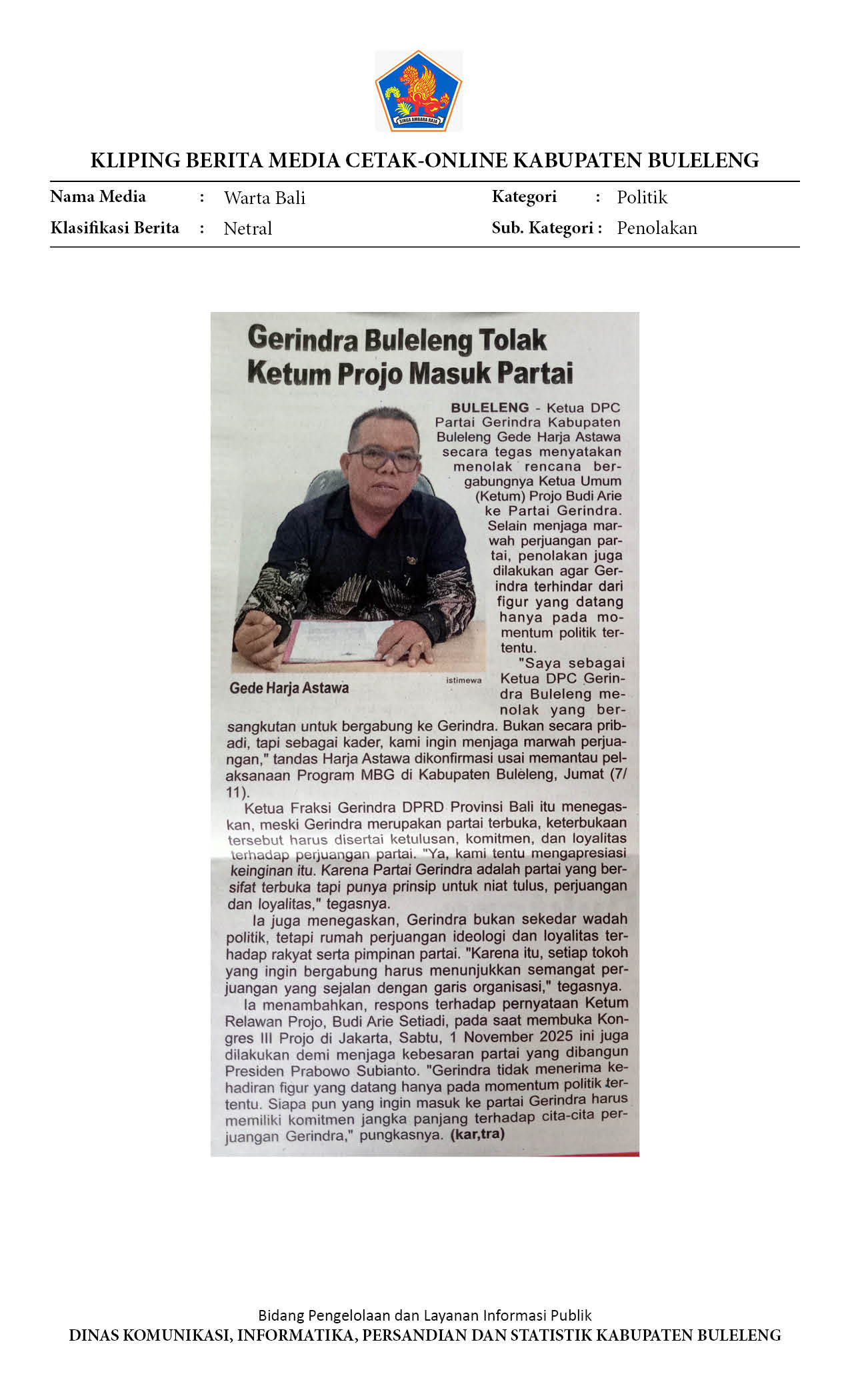 GERINDRA BULELENGTOLAK KETUM PROJO MASUK PARTAI