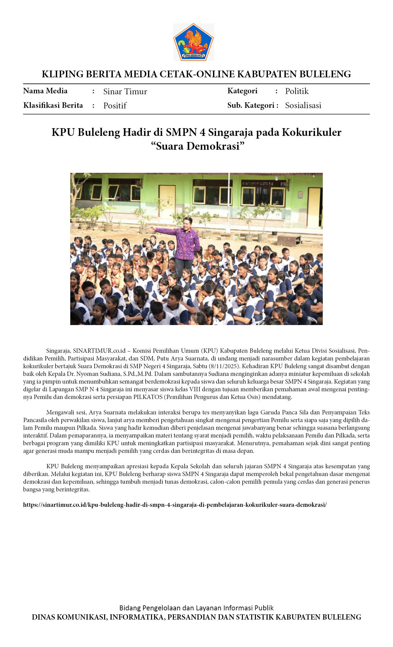 KPU BULELENG HADIR DI SMPN 4 SINGARAJA PADA KOKURIKULER “SUARA DEMOKRASI”