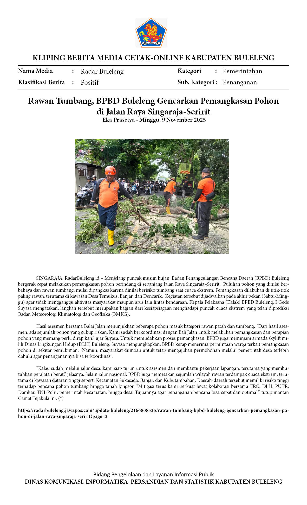 RAWAN TUMBANG, BPBD BULELENG GENCARKAN PEMANGKASAN POHON DI JALAN RAYA SINGARAJA-SERIRIT