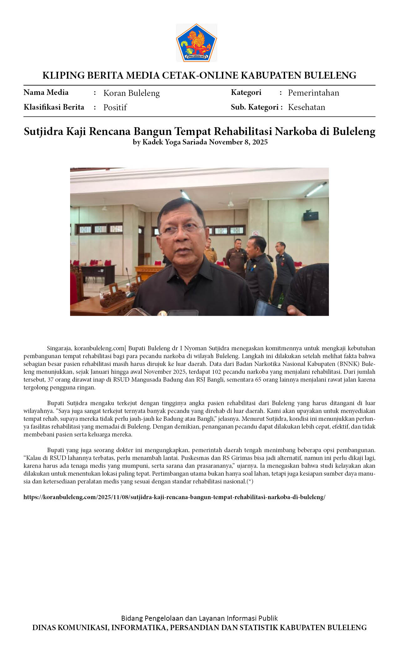 SUTJIDRA KAJI RENCANA BANGUN TEMPAT REHABILITASI NARKOBA DI BULELENG