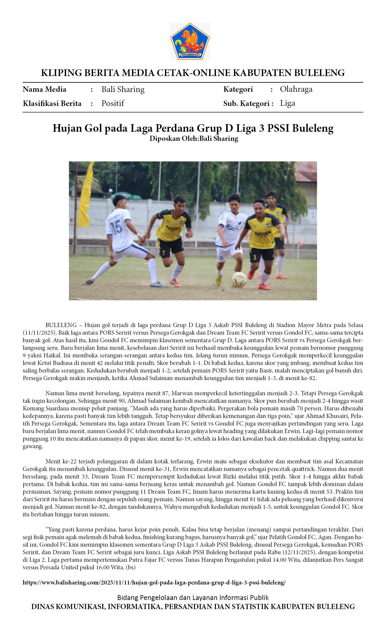 HUJAN GOL PADA LAGA PERDANA GRUP D LIGA 3 PSSI BULELENG