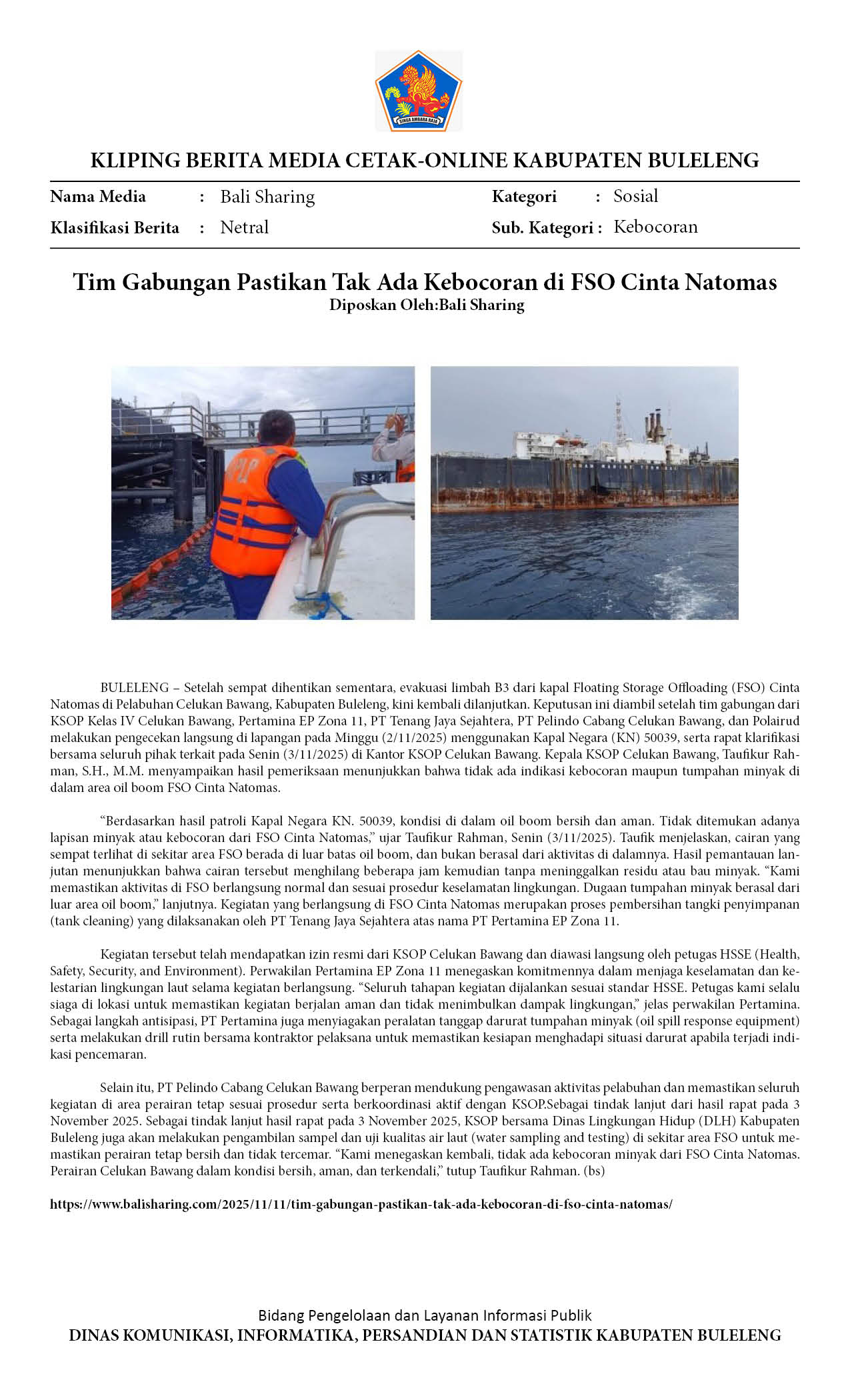 TIM GABUNGAN PASTIKAN TAK ADA KEBOCORAN DI FSO CINTA NATOMAS