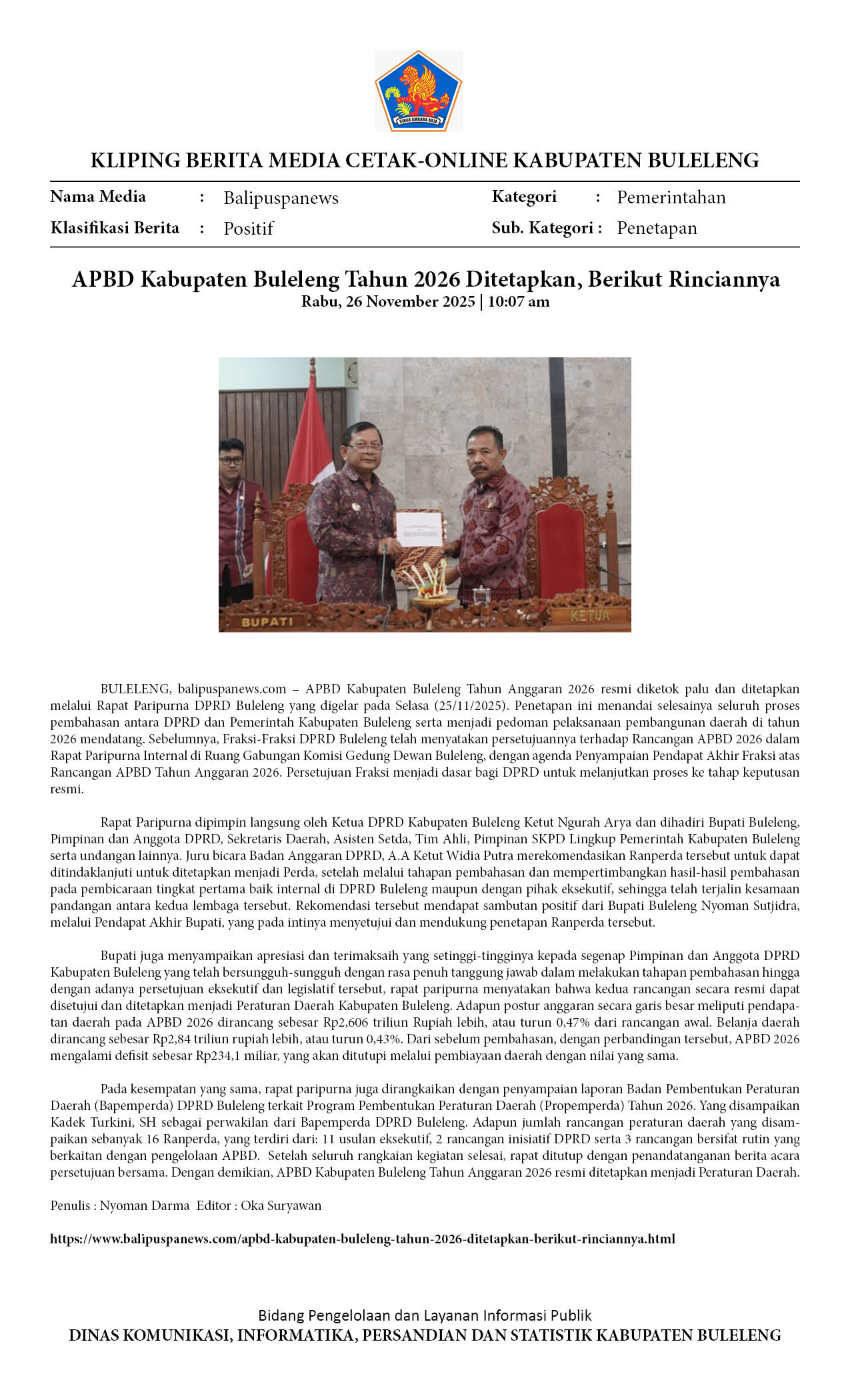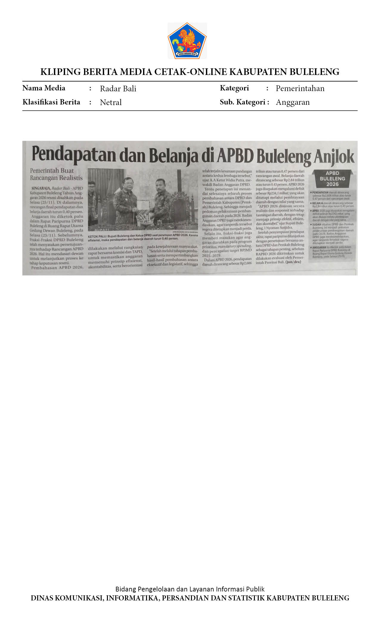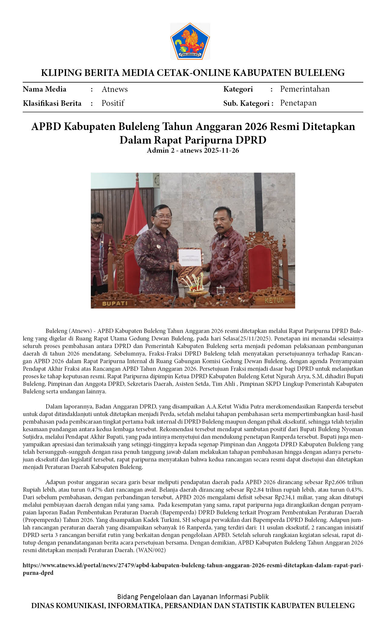 APBD KABUPATEN BULELENG TAHUN 2026 DITETAPKAN, BERIKUT RINCIANNYA