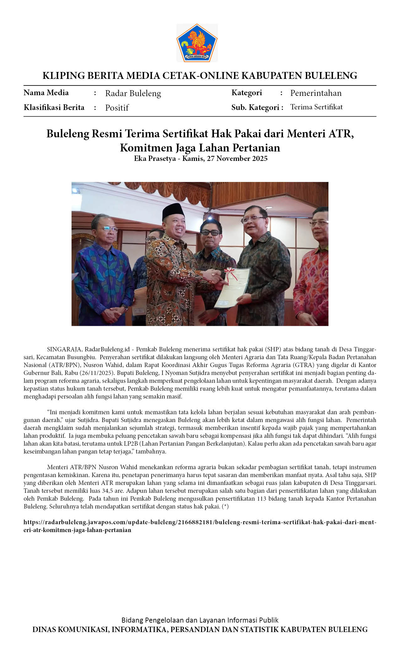 BULELENG RESMI TERIMA SERTIFIKAT HAK PAKAI DARI MENTERI ATR, KOMITMEN JAGA LAHAN PERTANIAN
