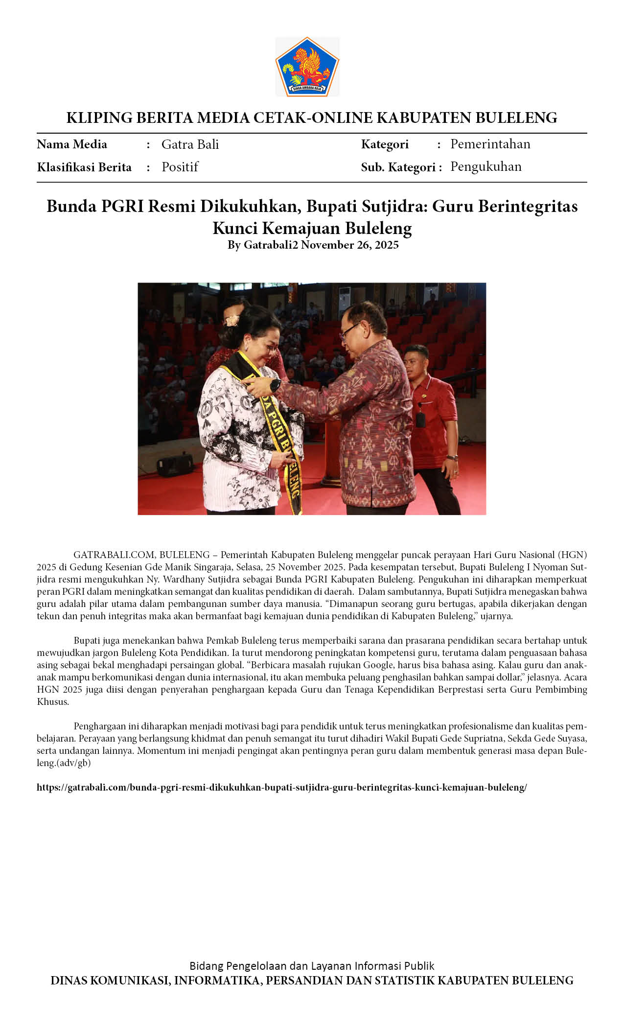 BUNDA PGRI RESMI DIKUKUHKAN, BUPATI SUTJIDRA: GURU BERINTEGRITAS KUNCI KEMAJUAN BULELENG