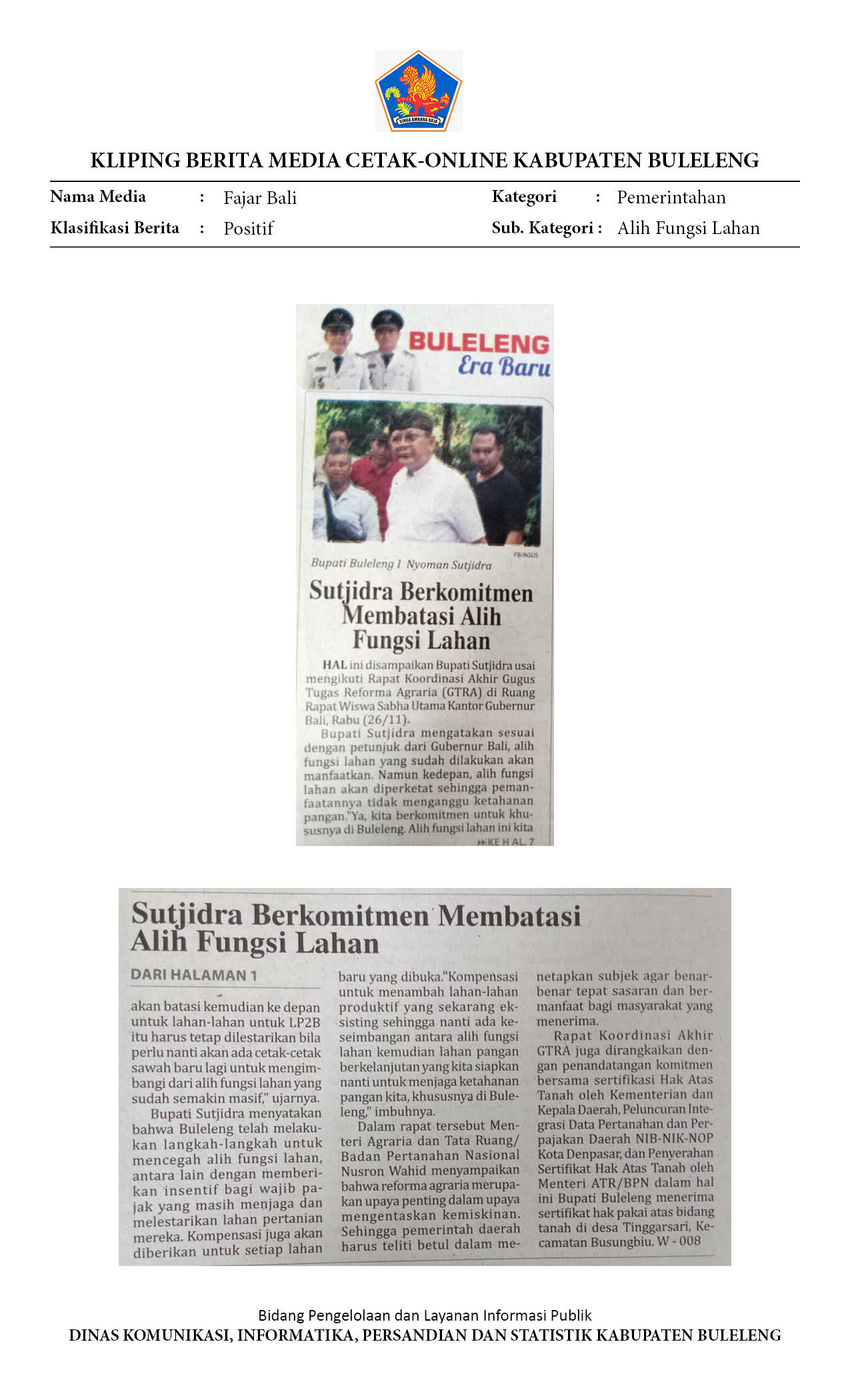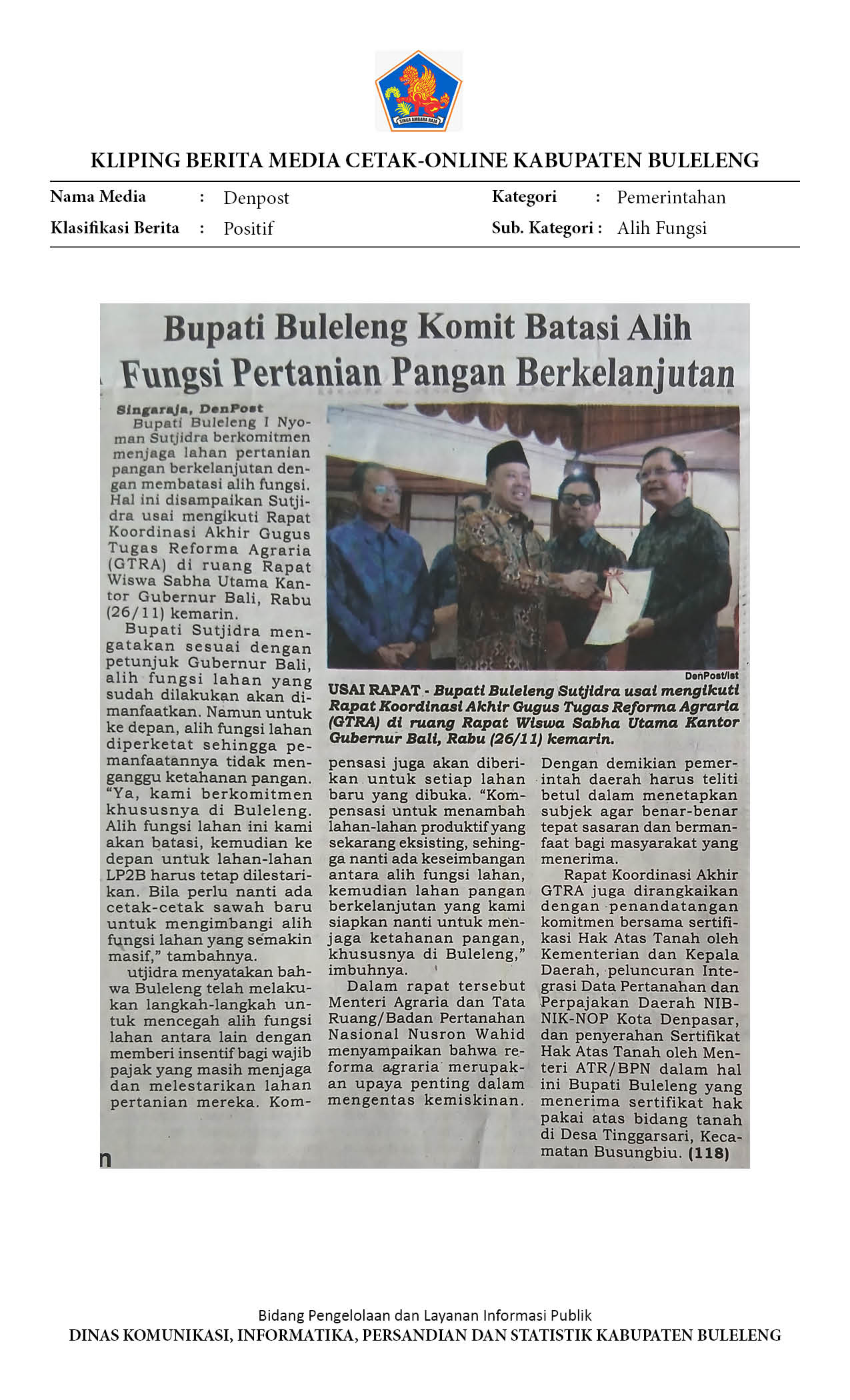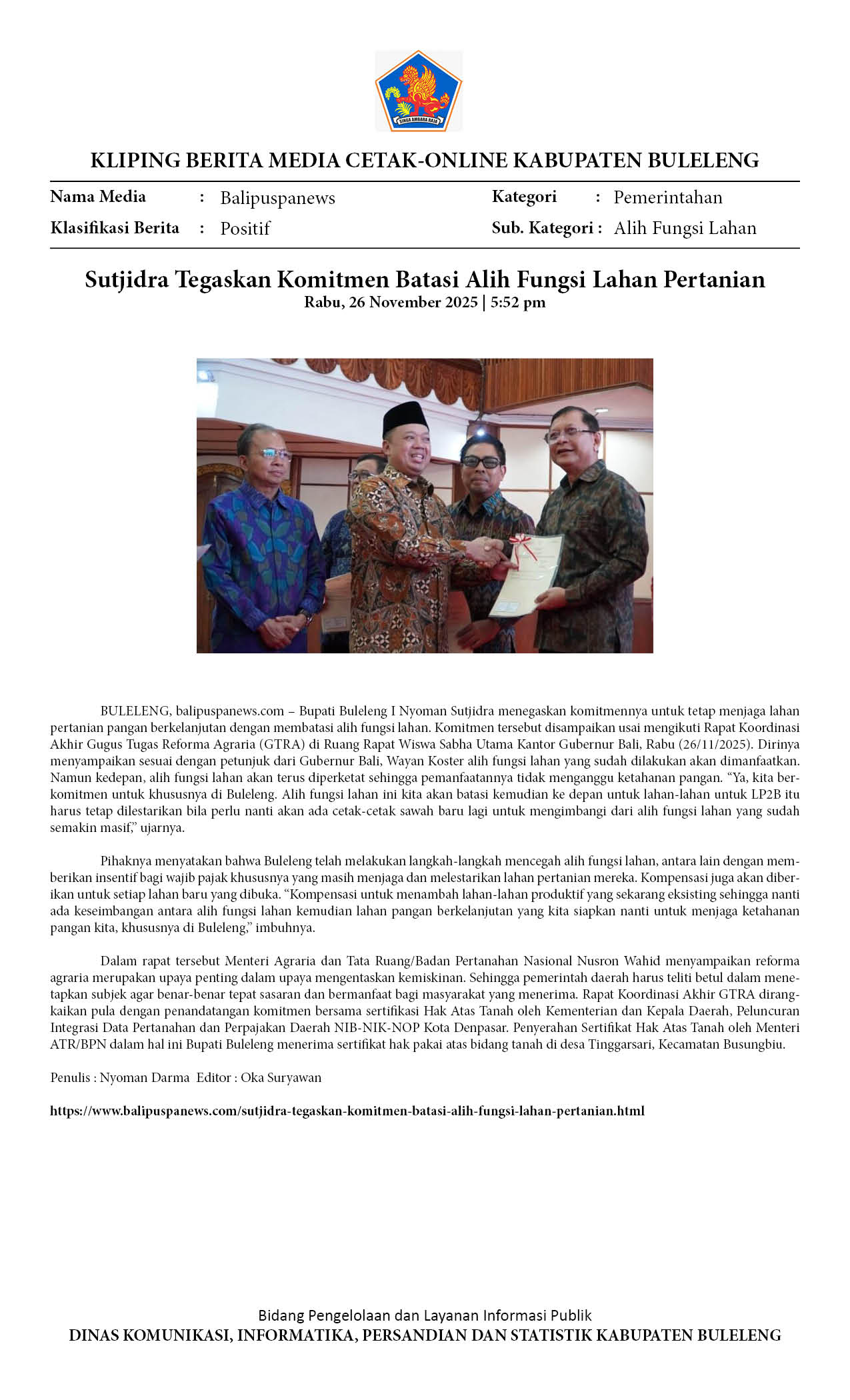 BUPATI BULELENG KOMIT BATASI ALIH FUNGSI PERTANIAN PANGAN BERKELANJUTAN