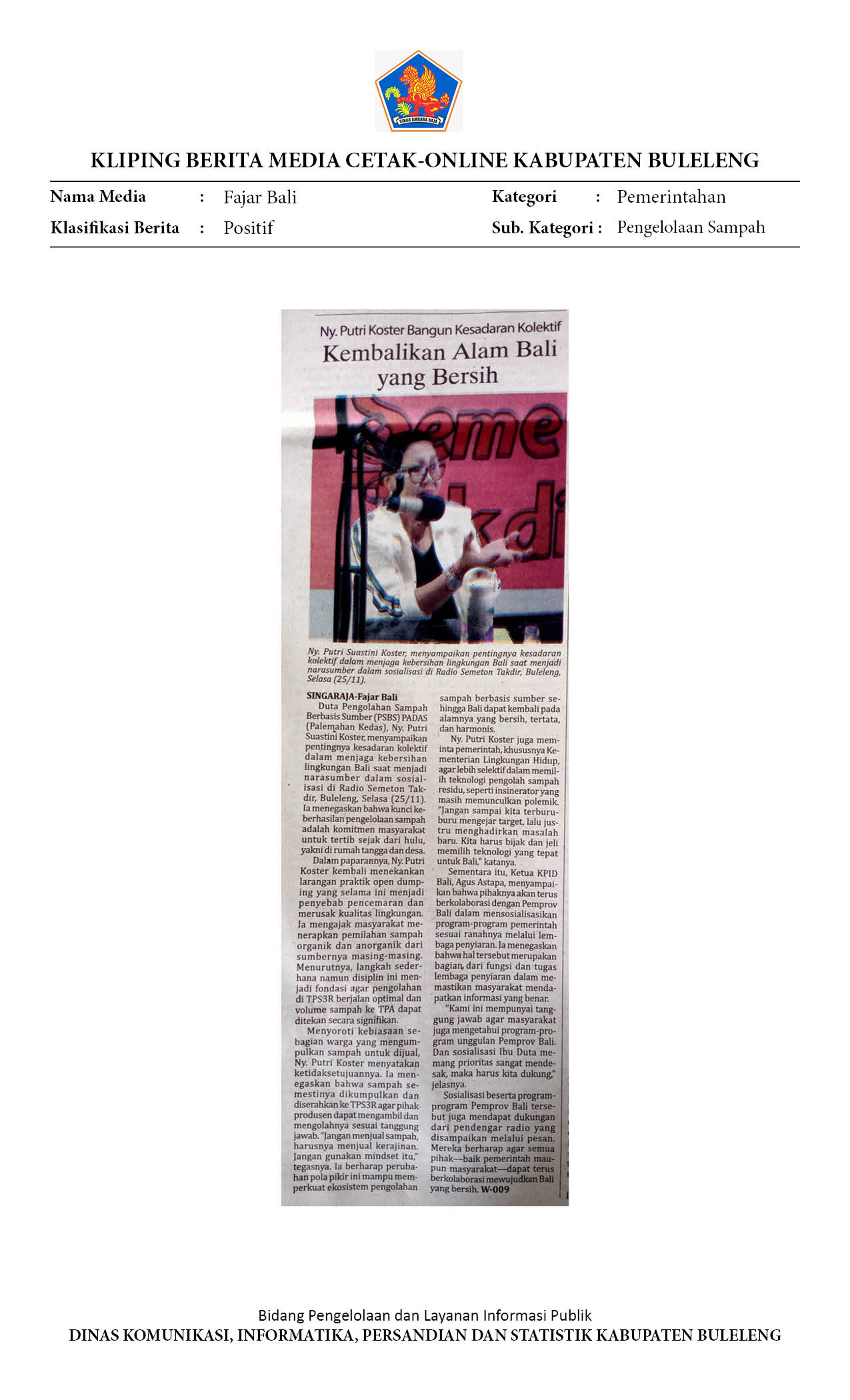 NY. PUTRI KOSTER BANGUN KESADARAN KOLEKTIF KEMBAIKAN ALAM BALI YANG BERSIH